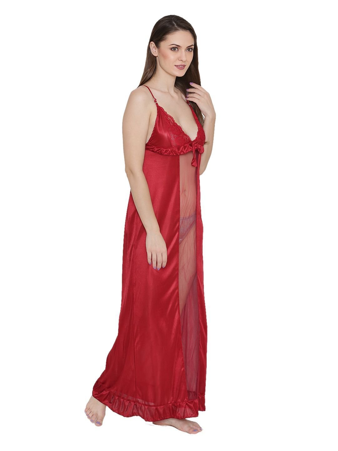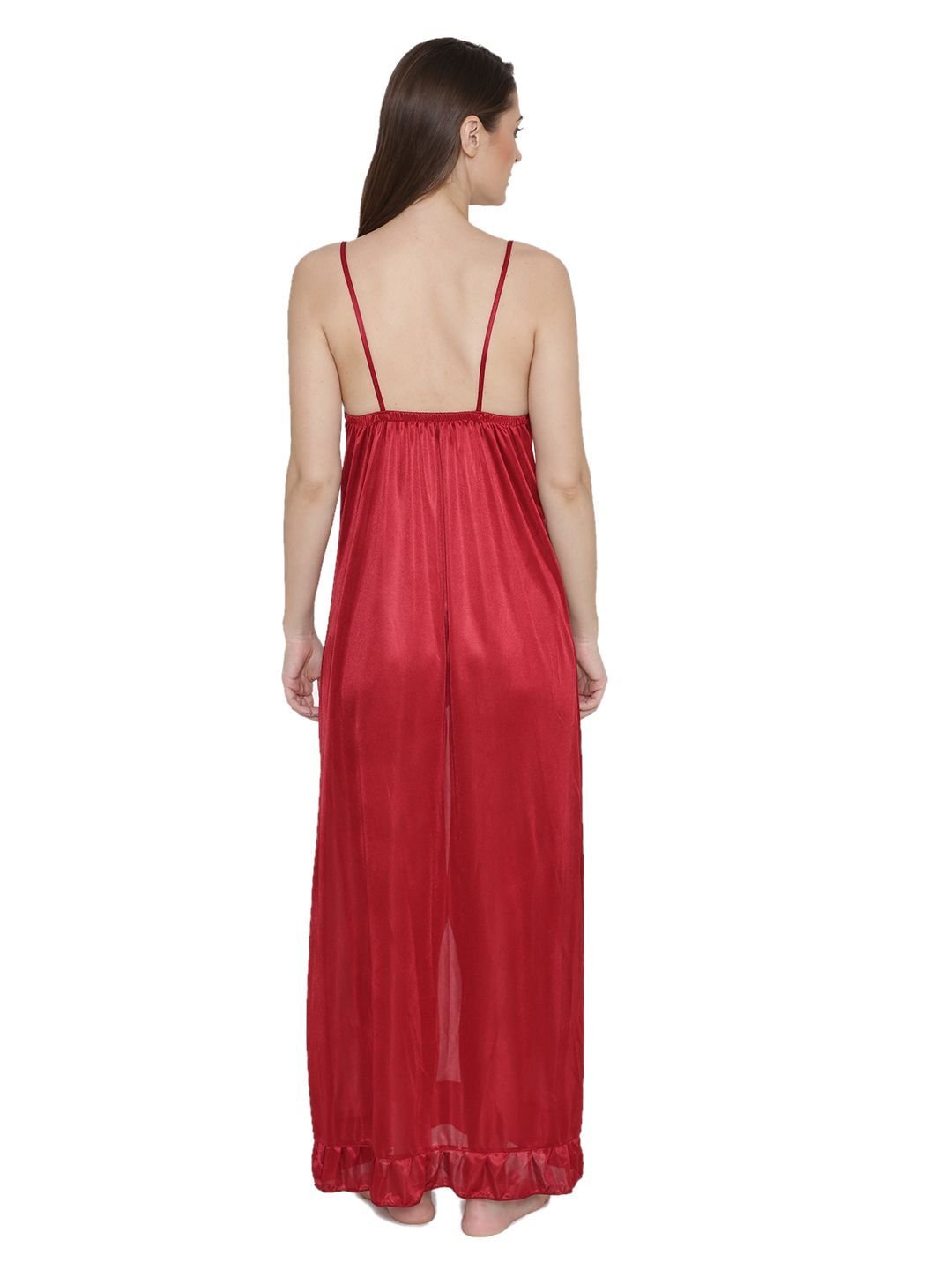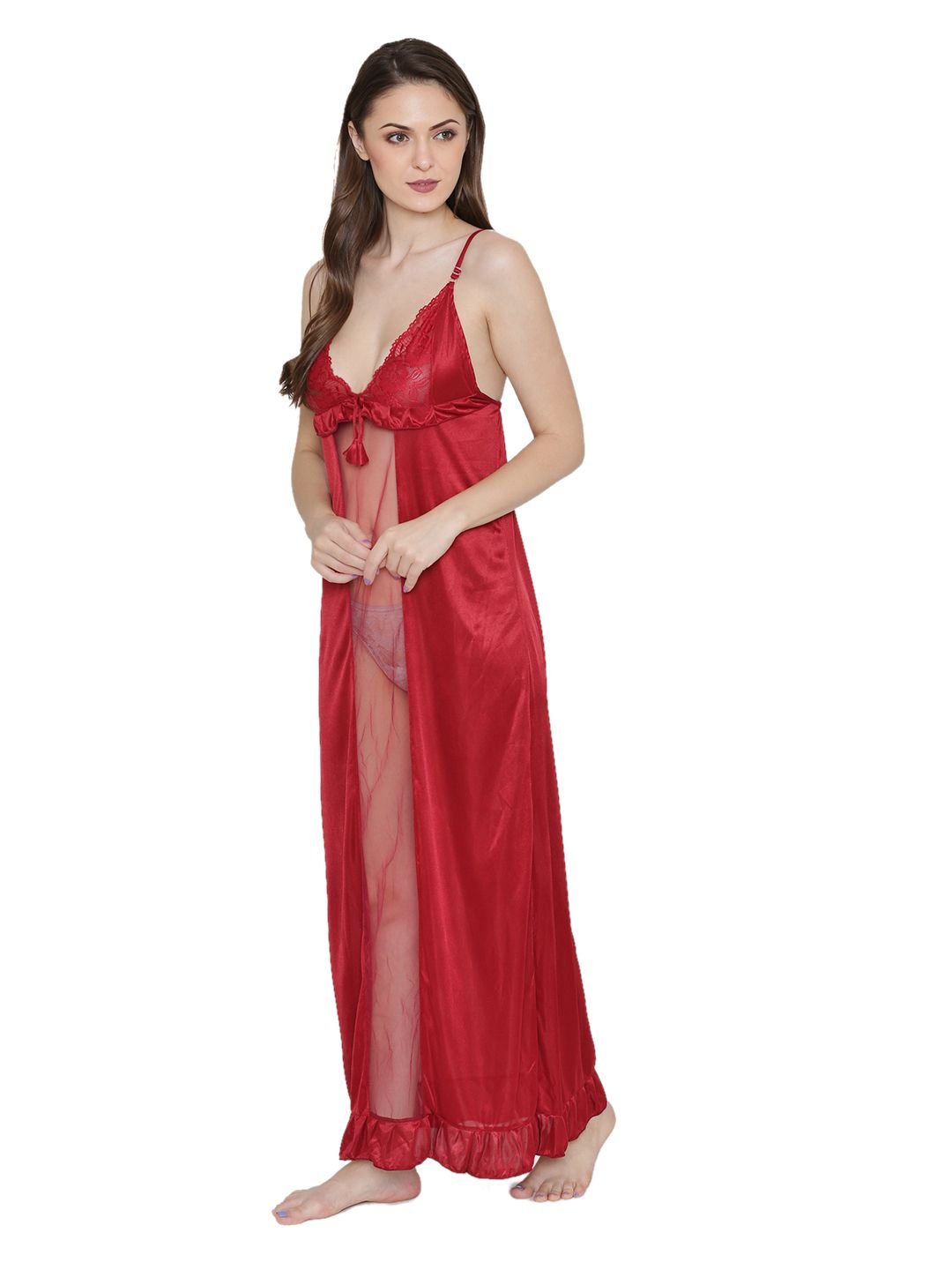 N-Gal Women's Satin Lace Deep Neck Ruffle Edge Nighty Night Dress Nightwear_Red
