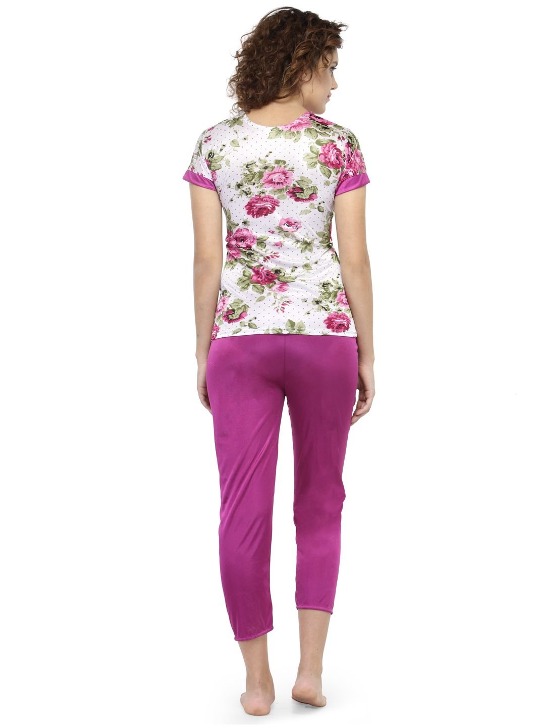 N-Gal Women's Satin Short Sleeves Floral Print Top Pyjama Set Nightwear Nightsuit_Magenta