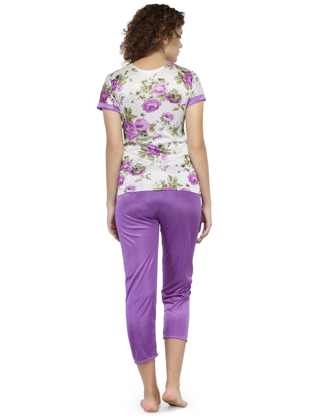 N-Gal Women's Satin Short Sleeves Floral Print Top Pyjama Set Nightwear Nightsuit_Purple