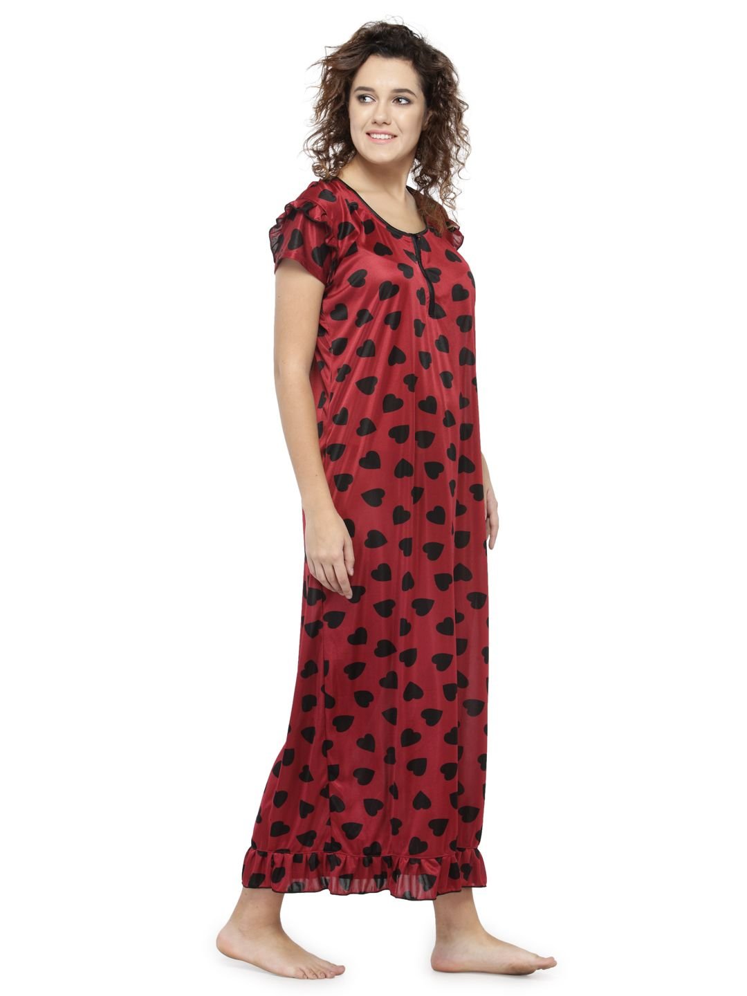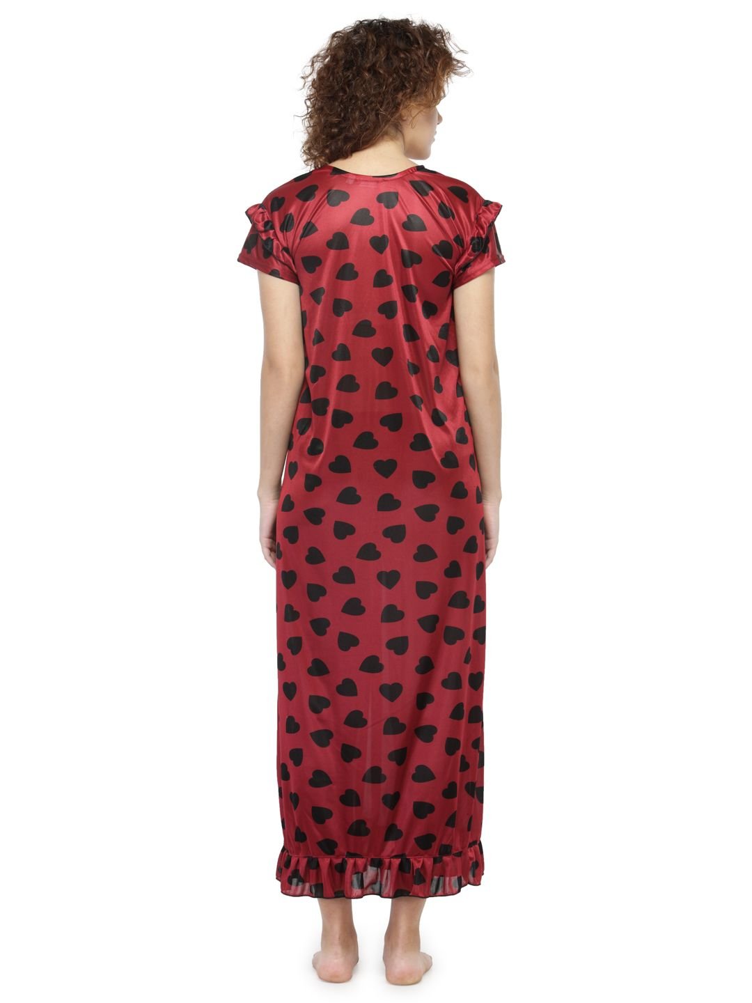 N-Gal Women's Satin Short Sleeves Hearts Print Maxi Nightwear Nightdress_Maroon