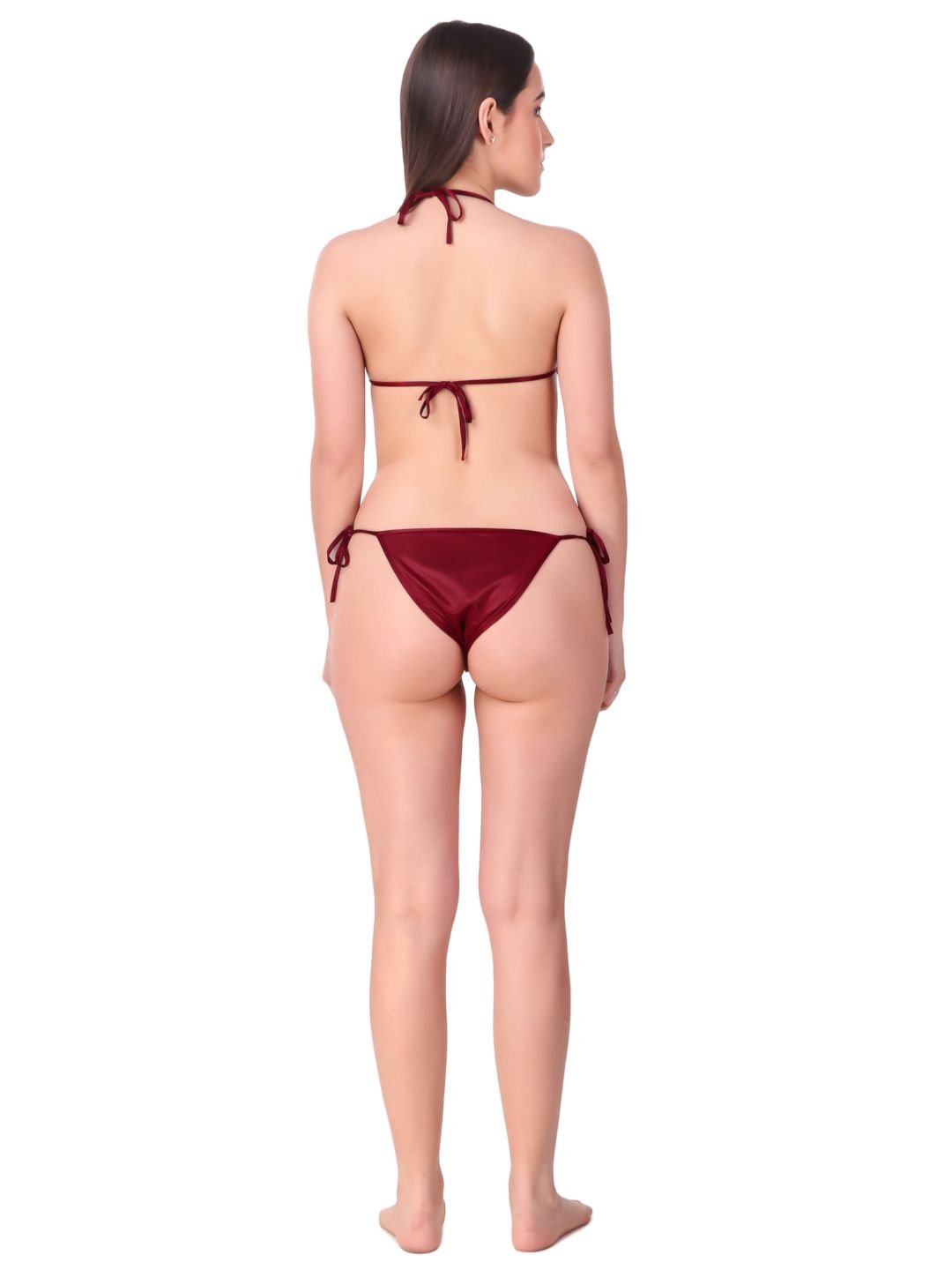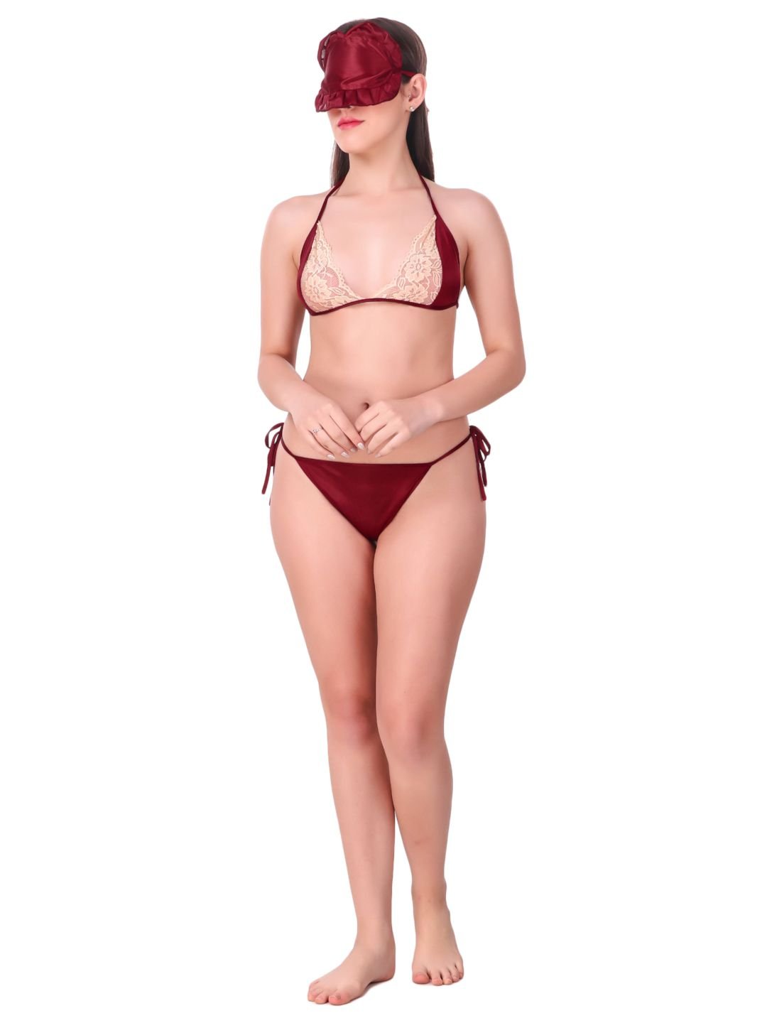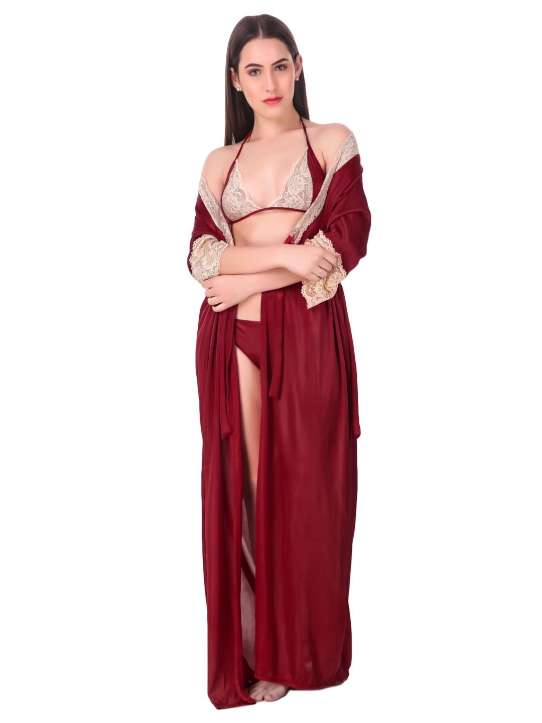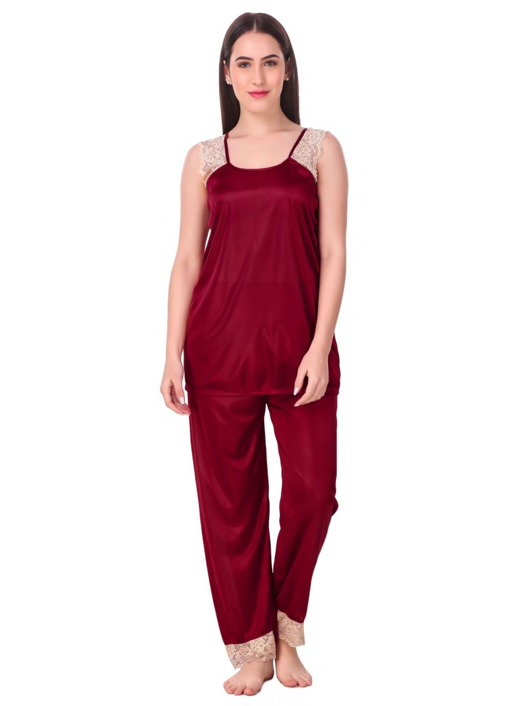 N-Gal Women's Satin Spandex Royal Lace Soft Nighty Lingerie Nightwear_Maroon