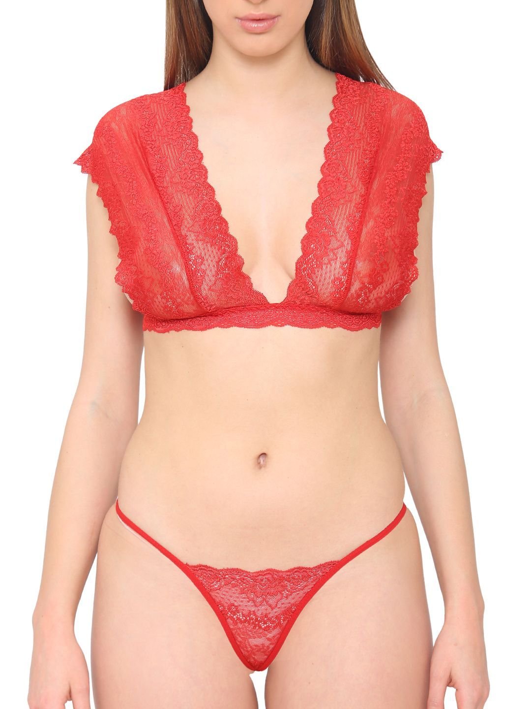 N-Gal Women's Wide Strap Lace V Back Bralette Underwear Lingerie Low Rise Thong Panty Set_Red