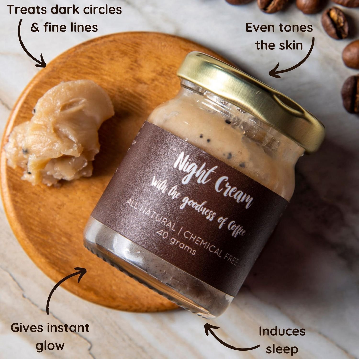 Say goodbye to all your under-eye problems and say hello to even tone glowing skin thanks to our coffee night cream.