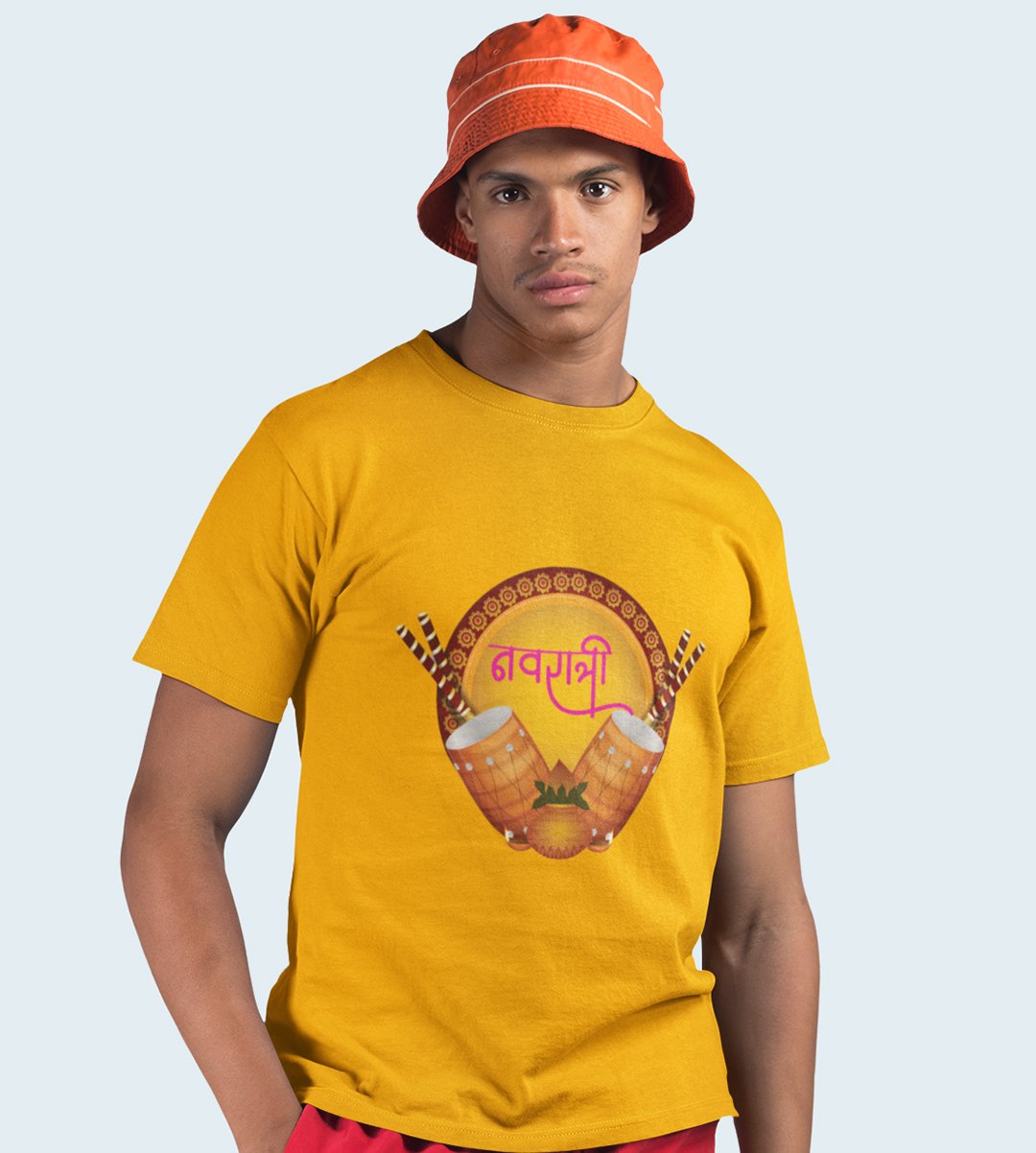 Navratri (2 dhaks) printed unisex adults round neck cotton half-sleeve yellow tshirt specially for Navratri festival/ Durga puja