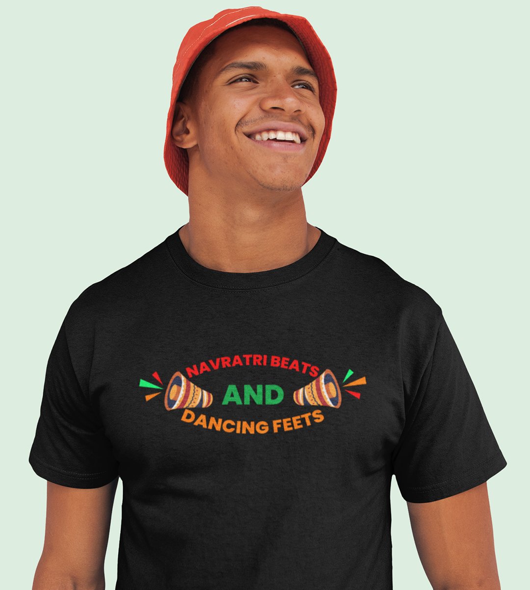 Navratri beats and dancing feets printed unisex adults round neck cotton half-sleeve black tshirt specially for Navratri festival/ Durga puja