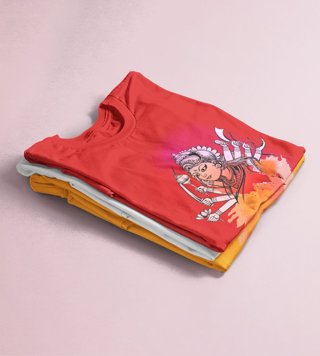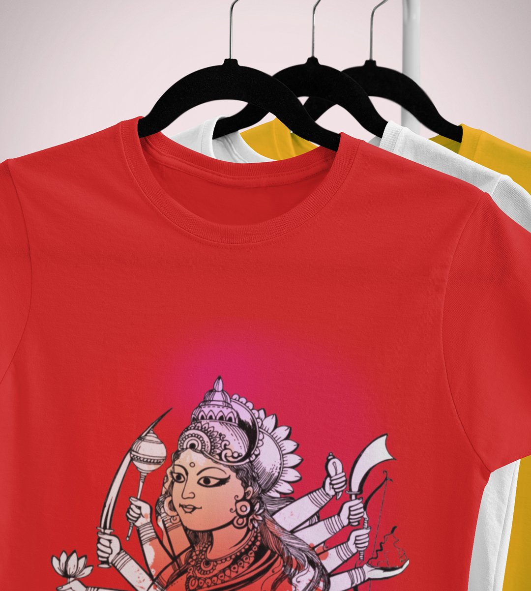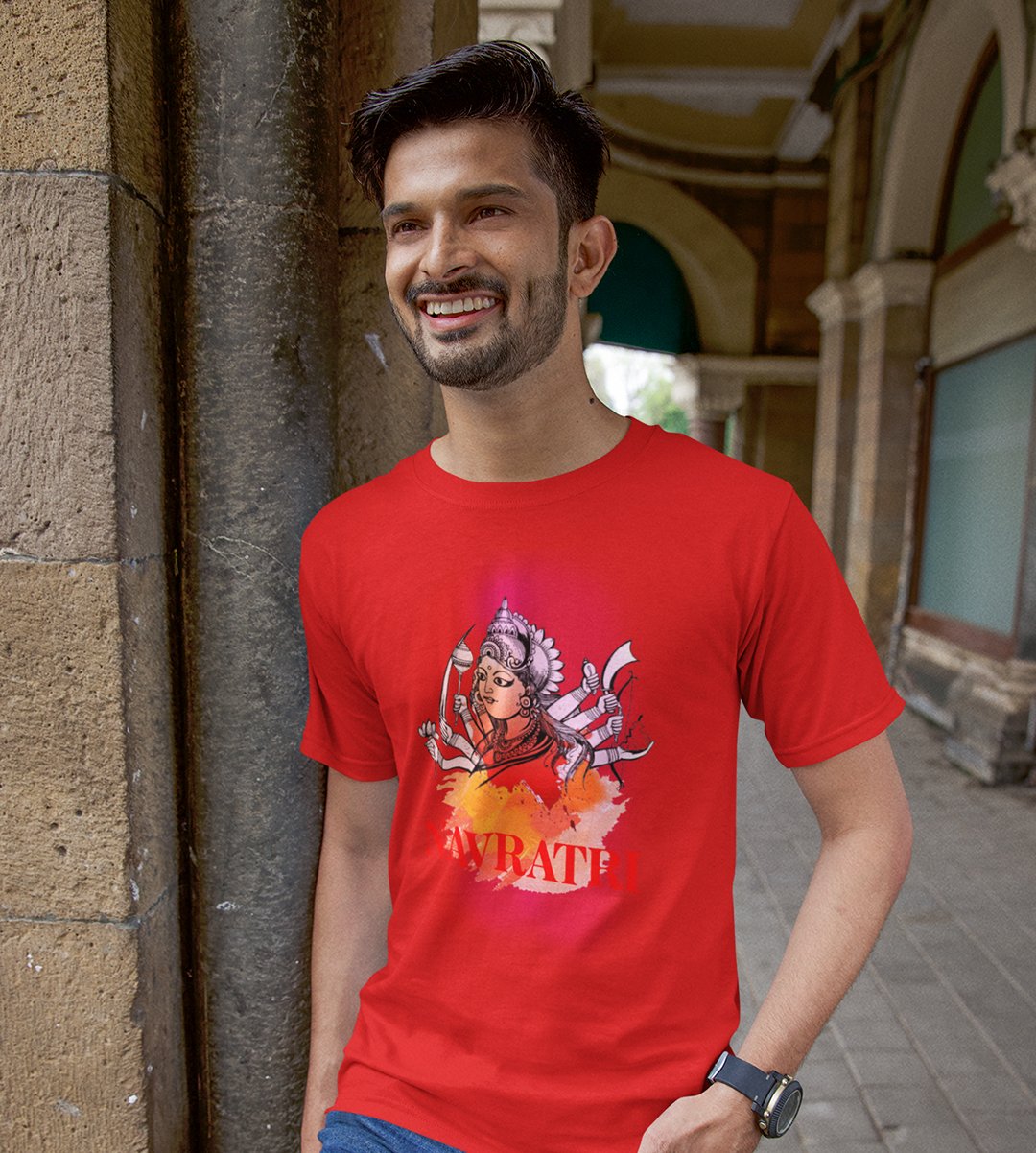 Navratri is a very auspicious festival for hindus. It takes place at the beginning of October and sometimes September. Enjoy the 9 days of festivities with full zeal and make yourself submerged in the love of Maa Durga. Navratri is also known as Durga Puja. And with this Tees, you can shine like a star during this festive season with our navratri themed cotton half sleeved Tshirts. You can pair our t-shirts with trousers and denim of your choice and make it a weekday smart casual or weekend wear. This is durable. This tshirt is smooth and soft which makes you comfortable to wear during all seasons. The printing in it is durable and odourless. It has five sizes, S,M,L,XL,XXL. The Tshirt colour is intact even after repeated washes. It can be kept in your wardrobe and hangers. Please avoid washing mashine to clean this Tee, it may affect the print. Hand wash only. We have brought you many navratri related designs printed on our different colour Tshirts to choose from. Grab it now.