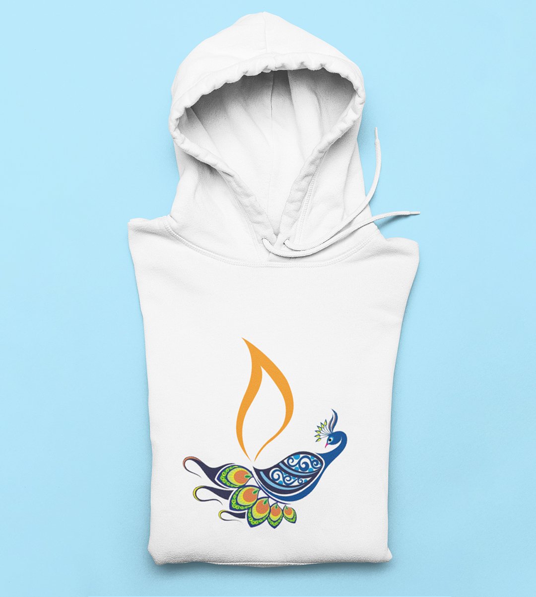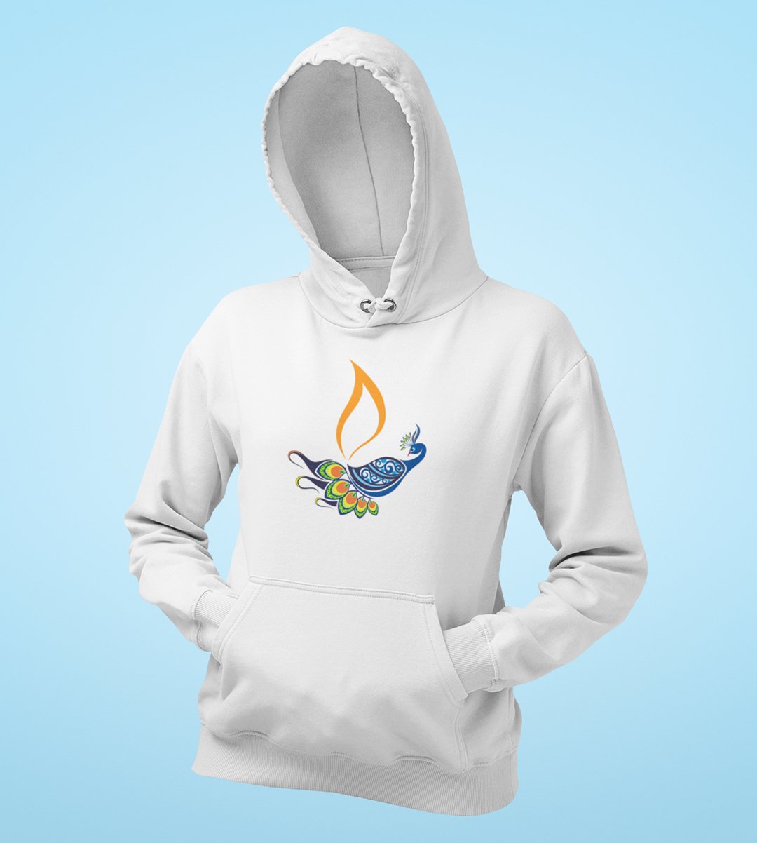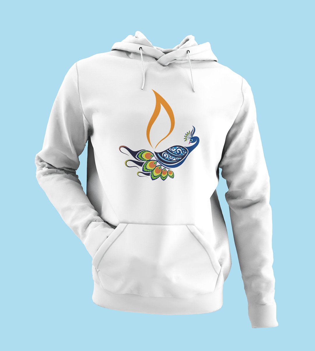 Embrace the majesty of Diwali with our "Peacock Design" White Hoodie . The exquisite peacock illustration represents elegance and vibrancy, reflecting the grandeur of the festival. Sip in style and celebrate the festive beauty.