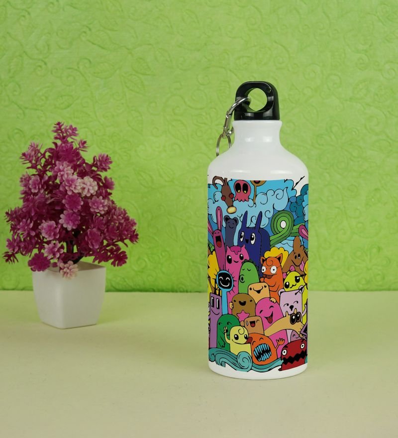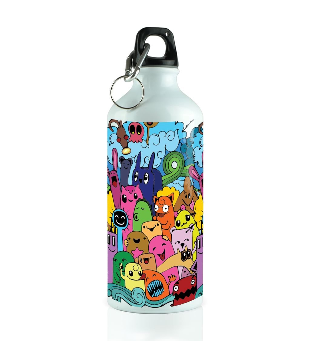 Playful Congestion of Creatures Doodles Printed Aluminium Water Bottle 600ml
