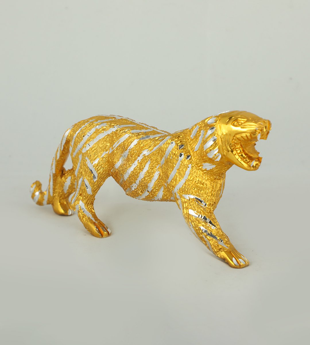 The golden tiger/ jaguar/ panther is made of special metal alloy which makes them very sturdy and durable. They are light weight and can be kept anywhere. Add an element of beauty to your home decor. It can also be an ideal addition to your living room, guest room, drawing room. It enhance the decor value of the temple, house, office, hotel, restaurent etc. It brings peace & happiness among the home members. It is very appealing and eye catching as a home decor item. It is used to keep in home's showpiece keeper, car's dashboard, receptionist's table etc It could be a memorable gift to your wedding, house warming, anniversary or festive occasions, it can be a memorable return gift.What can be a better gift than a handcrafted antique metal statue for your loved ones? Gift it to yourself or Friend, Spouse, Mother, Father, Grand Parents. Beautifully handcrafted and ornamented tiger showpiece / statue, glows with golden glitters, made with glittery material. Keep this statue at your home and office for decoration. It's also a perfect gift for the people who loves to decorate their home.