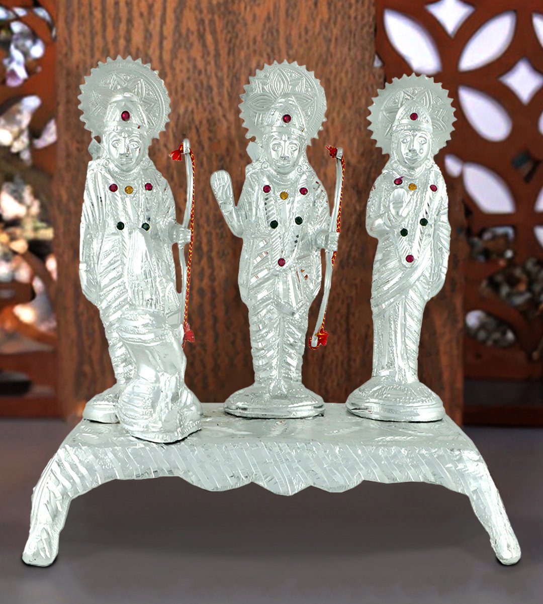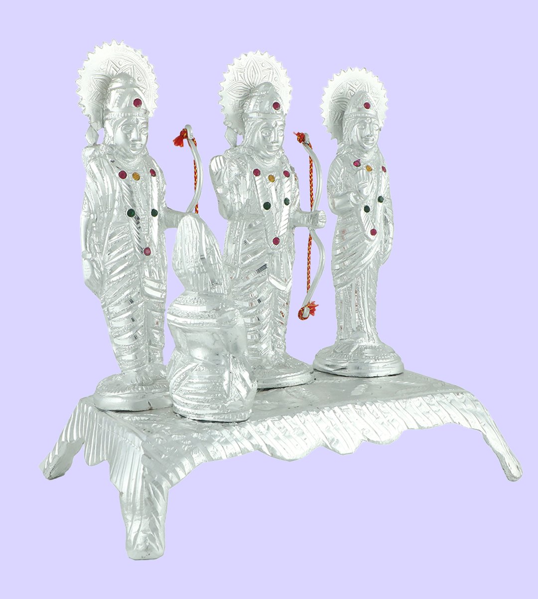Sterling metal silver colour decorative lord ram, laxman and seeta figurine/ murti which is a work of art. This elegant, sterling, silver decorative lord ram, laxman and seeta figurine depicts elegance, artistic brilliance and spirituality. It can be placed on your home, car's dashboard and pooja ghar to bring positivity, mental health, peace and happiness among the home members. Replete with minute detailing, fine carving and embedded gemstones, add positivity, spiritual vibes and peaceful meditating atmosphere to your home or vehicle's dashboard with this elegant masterpiece. Don't wash, use dry cotton cloth to remove dirt.