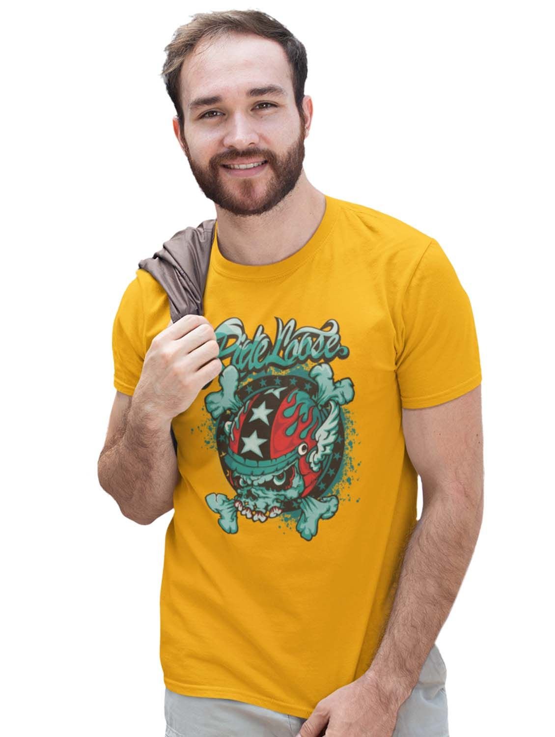 Ride Loose, (BG Blue) Yellow Round Neck Cotton Half Sleeved T-Shirt with Printed Graphics