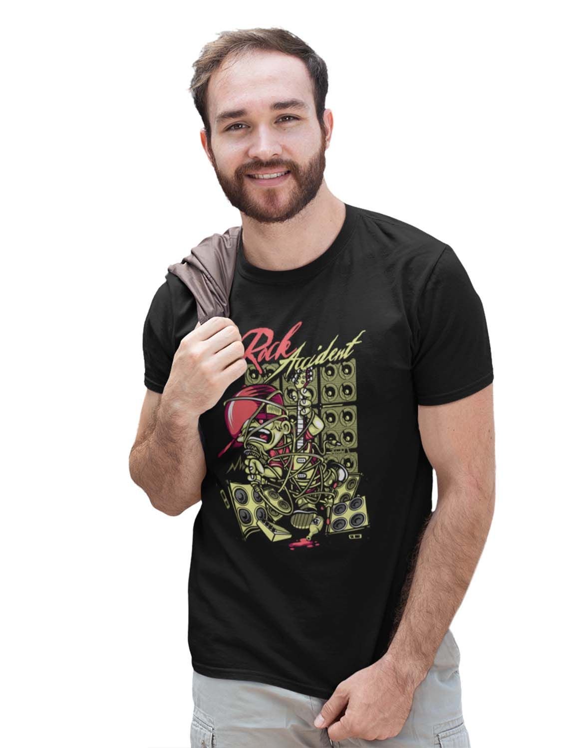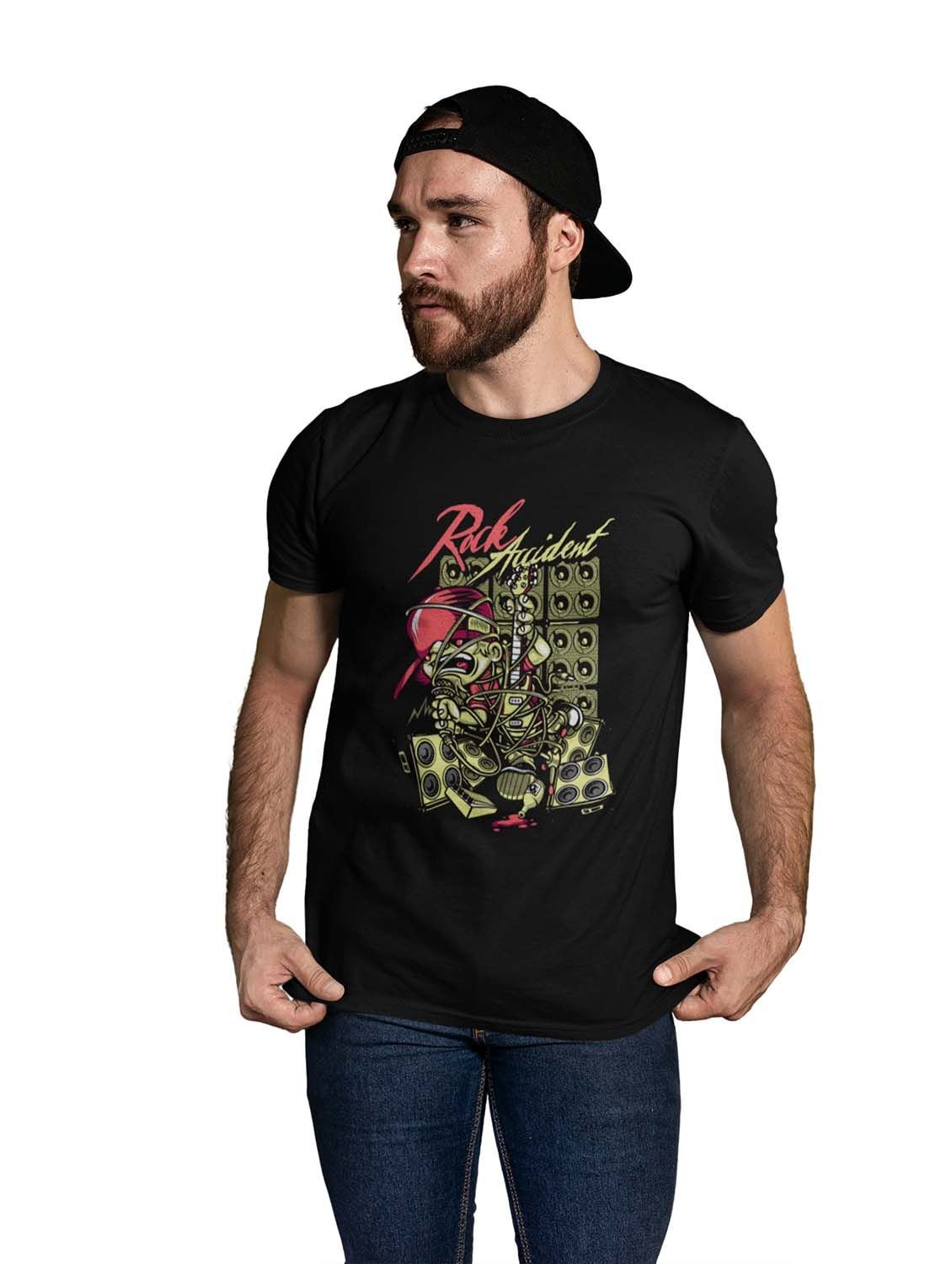 Rock Accident Black Round Neck Cotton Half Sleeved T-Shirt with Printed Graphics
