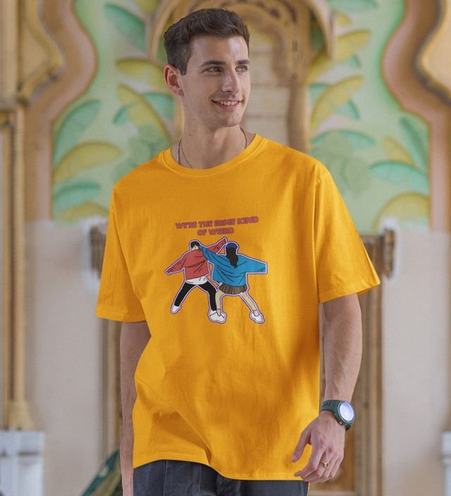 Same Kind Of Wierd Yellow Round Neck Cotton Half Sleeved Men T Shirt with Printed Graphics