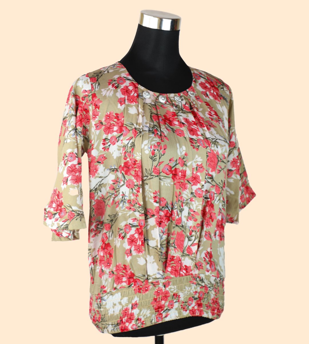 Sandy Elegance: Women's Sand Top with Red Floral Accents