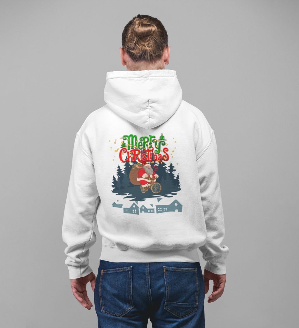 Santa Happily Riding a Bicycle Filled with Gifts Printed White Cotton Hoodie