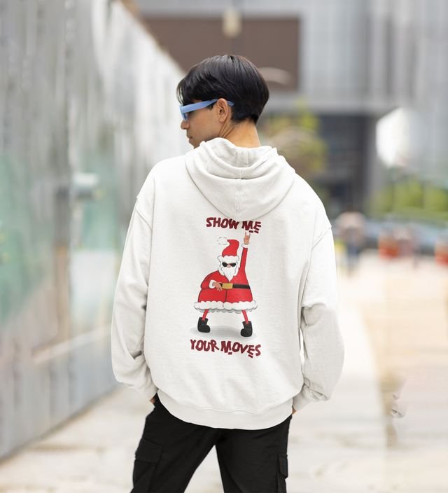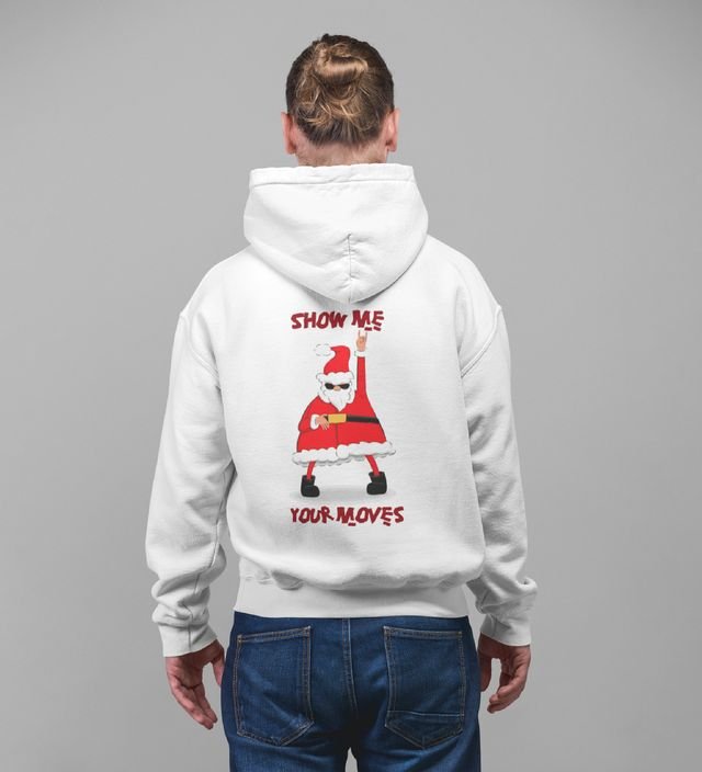 Santa Showing Off Dance Moves with Enthusiasm and Energy Printed White Cotton Hoodie