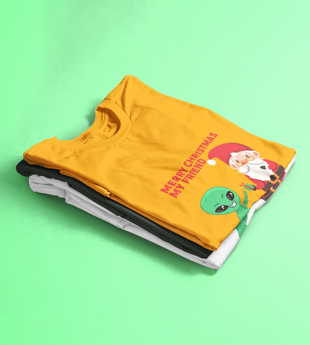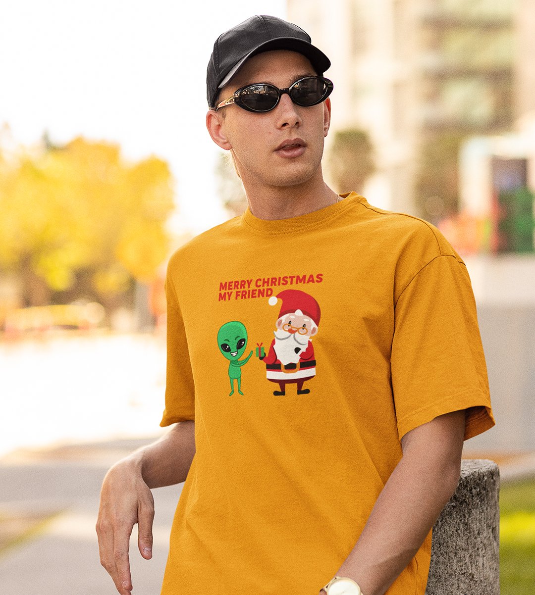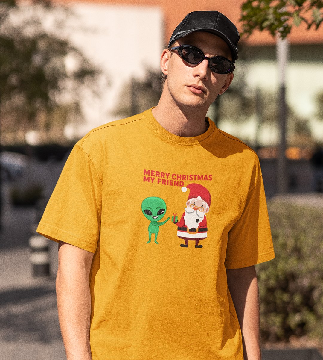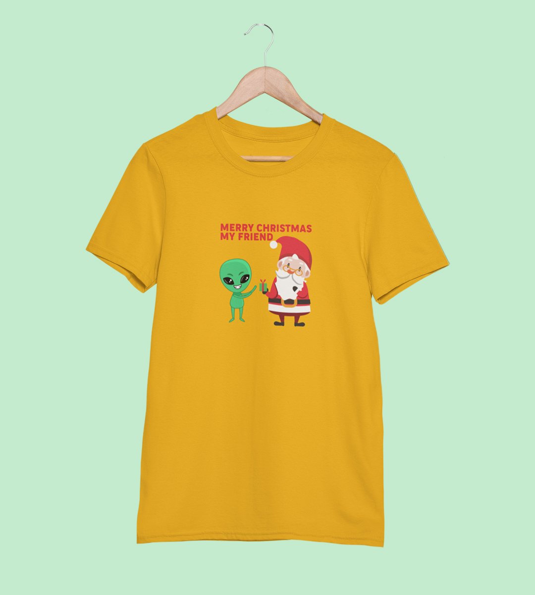 Santa With His Friend : Most Uniquely Printed T-shirt (Yellow) Best Gift For Boys Girls