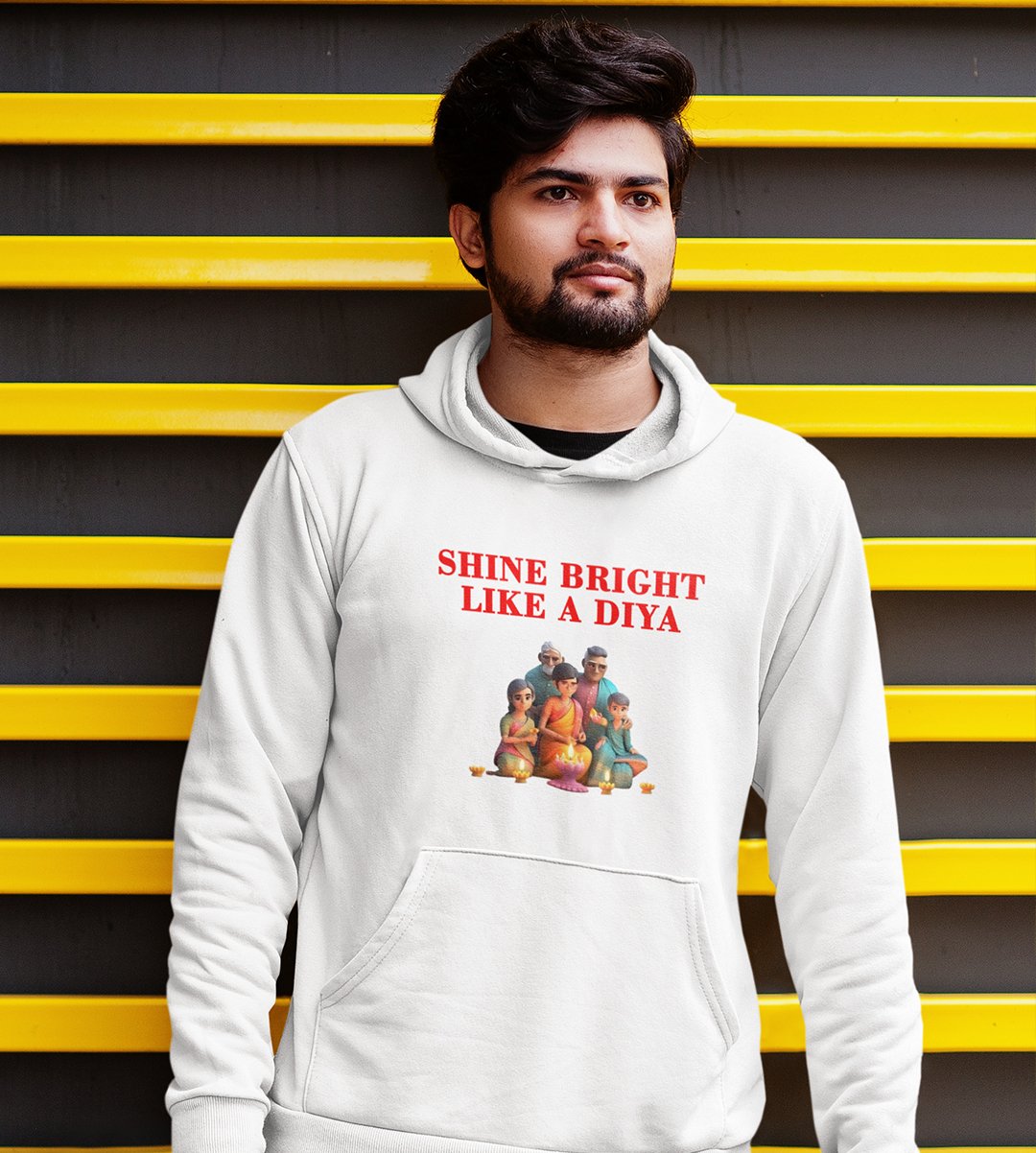 Embrace the luminous spirit of Diwali with our "Shine Bright Like A Diya" White Hoodie . The heartwarming design captures the essence of family celebrating the festival, radiating the warmth and togetherness that defines Diwali. Sip your and bask in the glow of Diwali with this heartwarming White Hoodie .