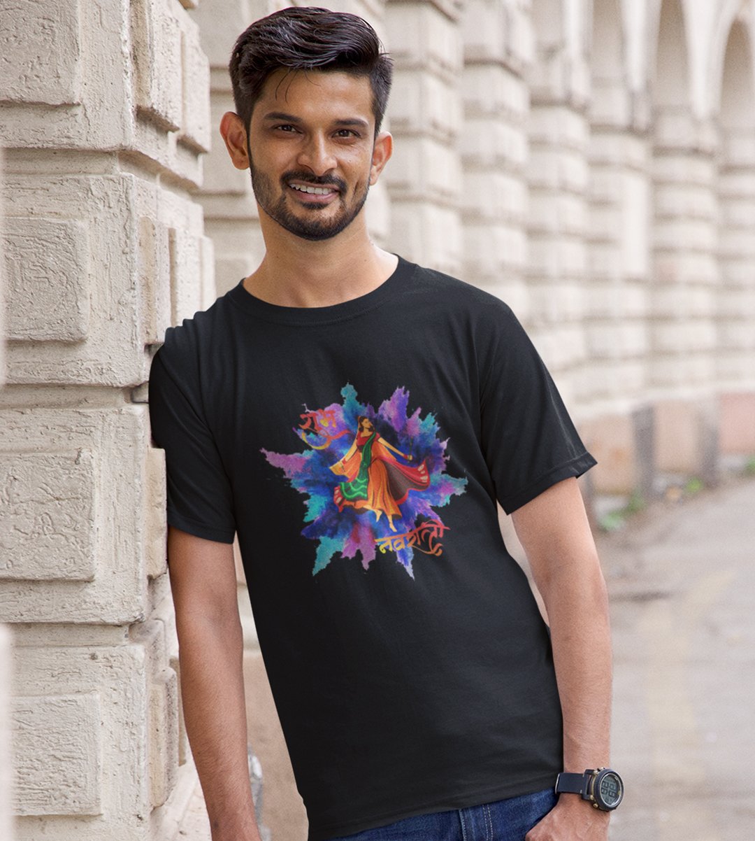 Shubh Navratri blasting colours printed unisex adults round neck cotton half-sleeve black tshirt specially for Navratri festival/ Durga puja