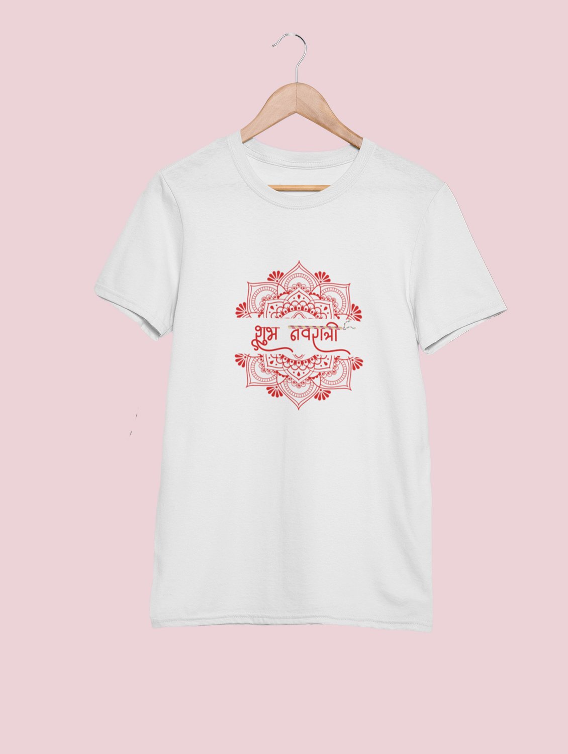 Navratri is a very auspicious festival for hindus. It takes place at the beginning of October and sometimes September. Enjoy the 9 days of festivities with full zeal and make yourself submerged in the love of Maa Durga. Navratri is also known as Durga Puja. And with this Tees, you can shine like a star during this festive season with our navratri themed cotton half sleeved Tshirts. You can pair our t-shirts with trousers and denim of your choice and make it a weekday smart casual or weekend wear. This is durable. This tshirt is smooth and soft which makes you comfortable to wear during all seasons. The printing in it is durable and odourless. It has five sizes, S,M,L,XL,XXL. The Tshirt colour is intact even after repeated washes. It can be kept in your wardrobe and hangers. Please avoid washing mashine to clean this Tee, it may affect the print. Hand wash only. We have brought you many navratri related designs printed on our different colour Tshirts to choose from. Grab it now.