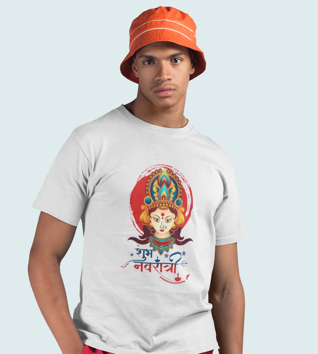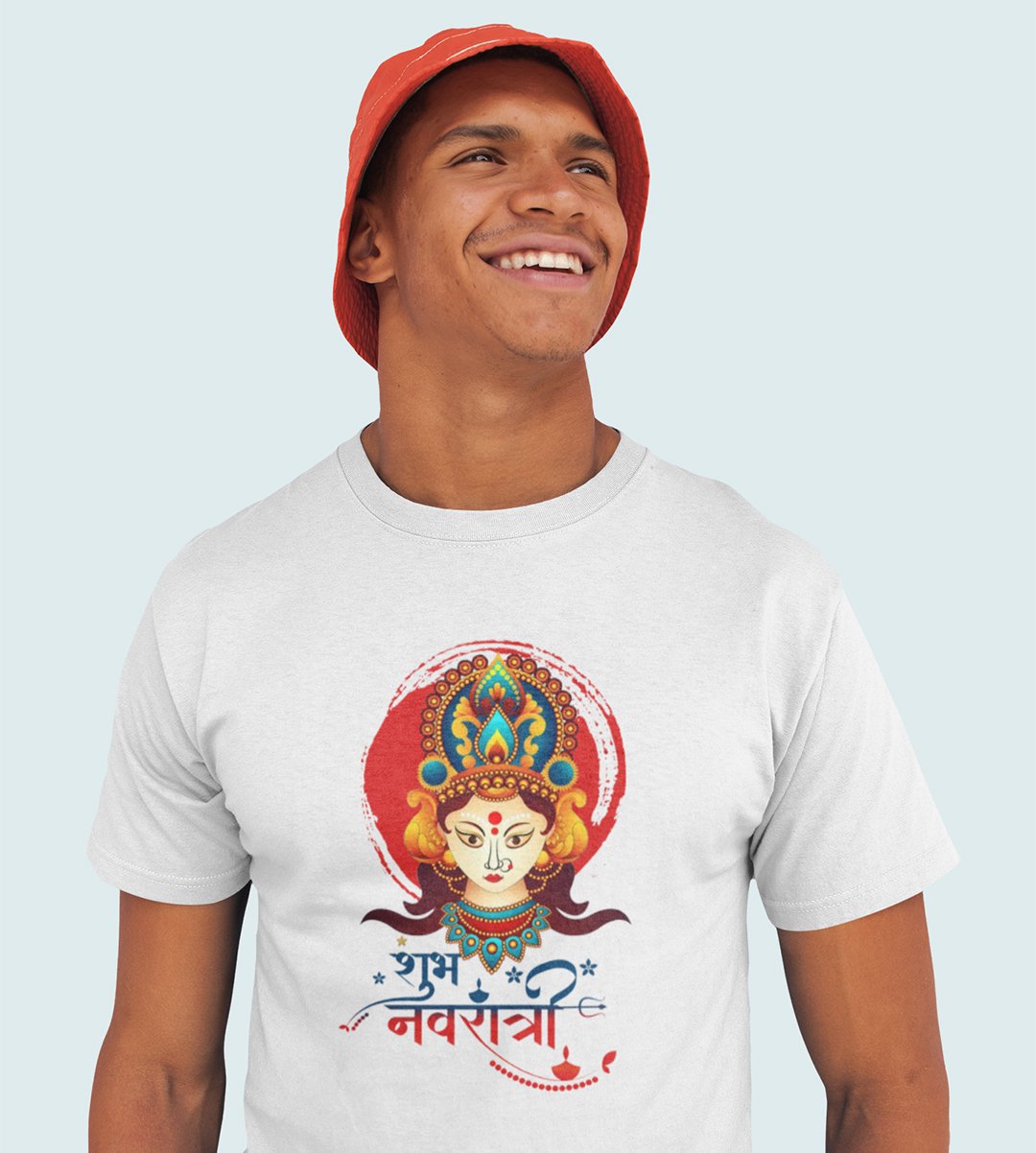 Navratri is a very auspicious festival for hindus. It takes place at the beginning of October and sometimes September. Enjoy the 9 days of festivities with full zeal and make yourself submerged in the love of Maa Durga. Navratri is also known as Durga Puja. And with this Tees, you can shine like a star during this festive season with our navratri themed cotton half sleeved Tshirts. You can pair our t-shirts with trousers and denim of your choice and make it a weekday smart casual or weekend wear. This is durable. This tshirt is smooth and soft which makes you comfortable to wear during all seasons. The printing in it is durable and odourless. It has five sizes, S,M,L,XL,XXL. The Tshirt colour is intact even after repeated washes. It can be kept in your wardrobe and hangers. Please avoid washing mashine to clean this Tee, it may affect the print. Hand wash only. We have brought you many navratri related designs printed on our different colour Tshirts to choose from. Grab it now.