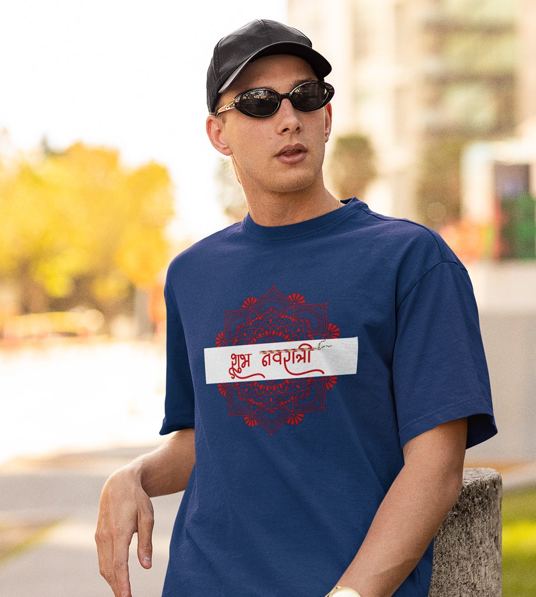 Shubh Navratri (red mandala) printed unisex adults round neck cotton half-sleeve blue tshirt specially for Navratri festival/ Durga puja
