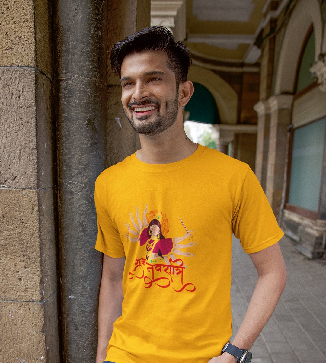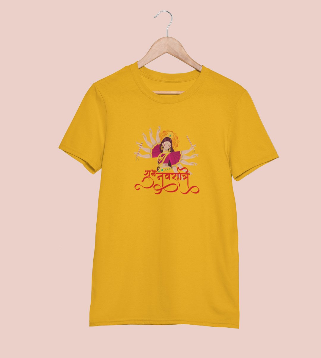 Shubh navratri text printed unisex adults round neck cotton half-sleeve yellow tshirt specially for Navratri festival/ Durga puja