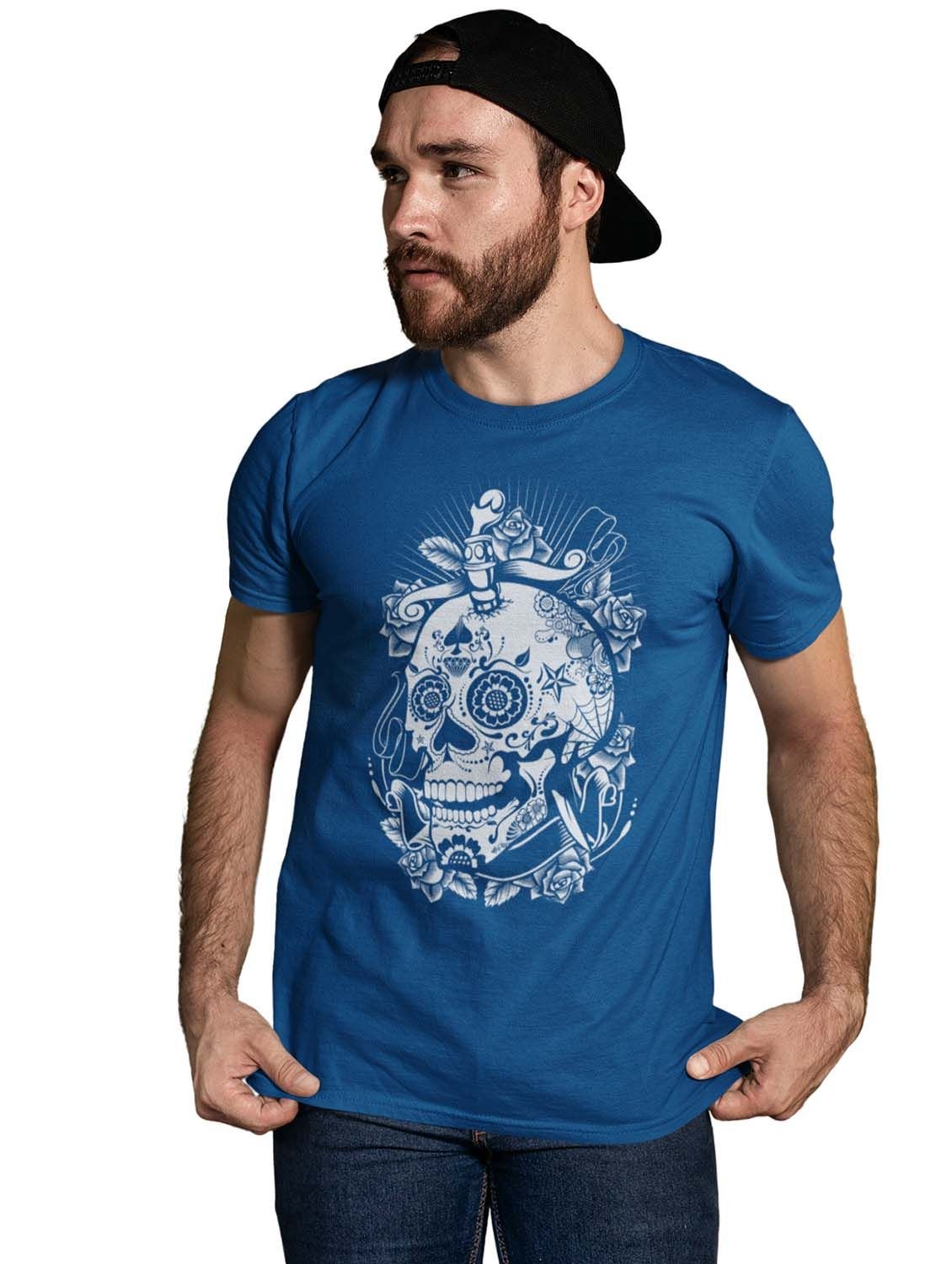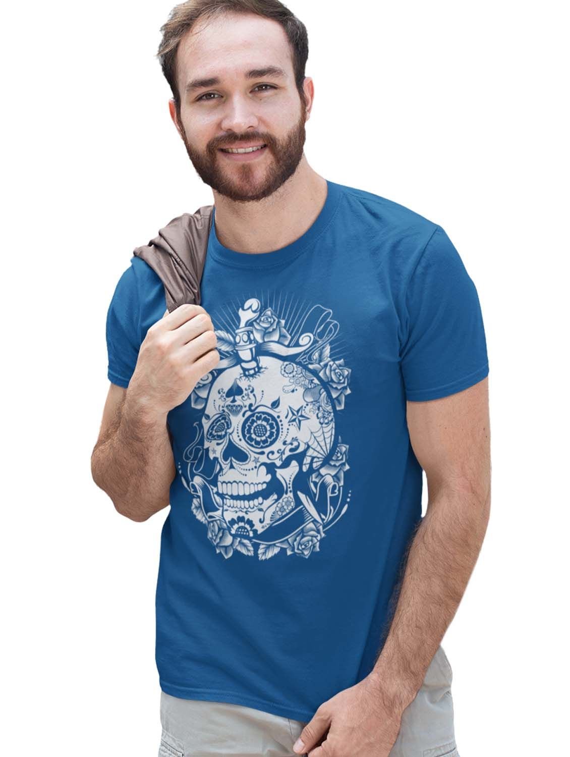 Rich Skull Blue Round Neck Cotton Half Sleeved T-Shirt with Printed Graphics