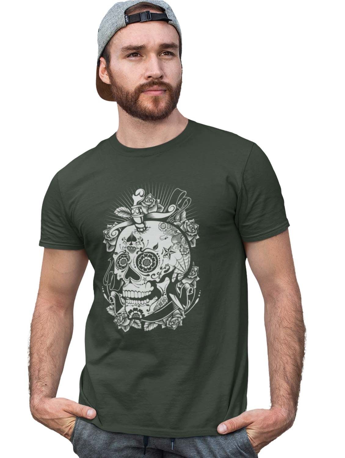 Tattooded Cranium Green Round Neck Cotton Half Sleeved T-Shirt with Printed Graphics