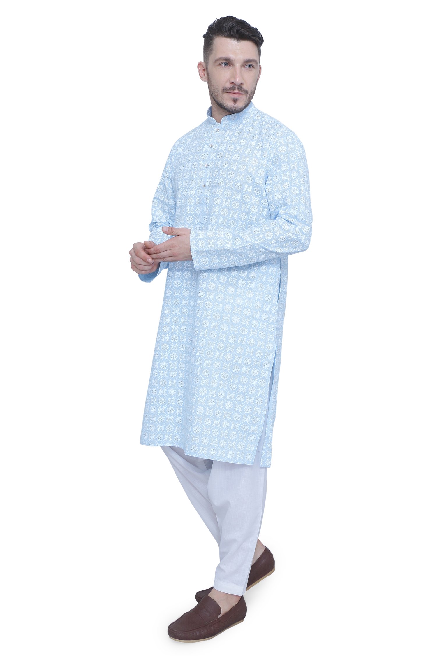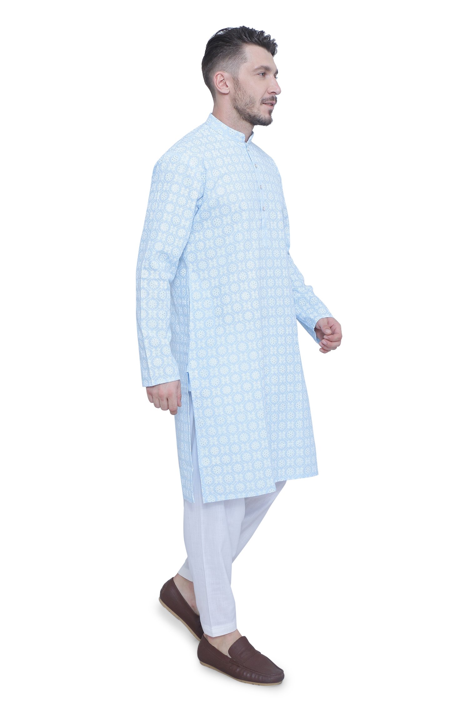 Elevate your summer wardrobe with our Sky Blue Cotton Men's Kurta, a versatile choice for every occasion. Crafted from pure cotton, this kurta offers cool comfort and breathability even on the warmest days. The subtle yet stylish floral print adds a touch of sophistication to your look. Embrace the soothing elegance of our Sky Blue Cotton Men's Kurta. The combination of pure cotton, a refreshing color, and floral print makes it a versatile choice for your summer wardrobe. Stay comfortable and stylish in this unique kurta that's perfect for any occasion.