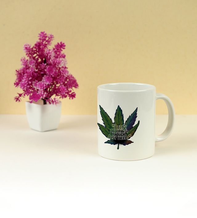 Start your day with a burst of vibrant energy! This printed coffee mug features a psychedelic leaf artwork surrounded by colorful flame-like patterns