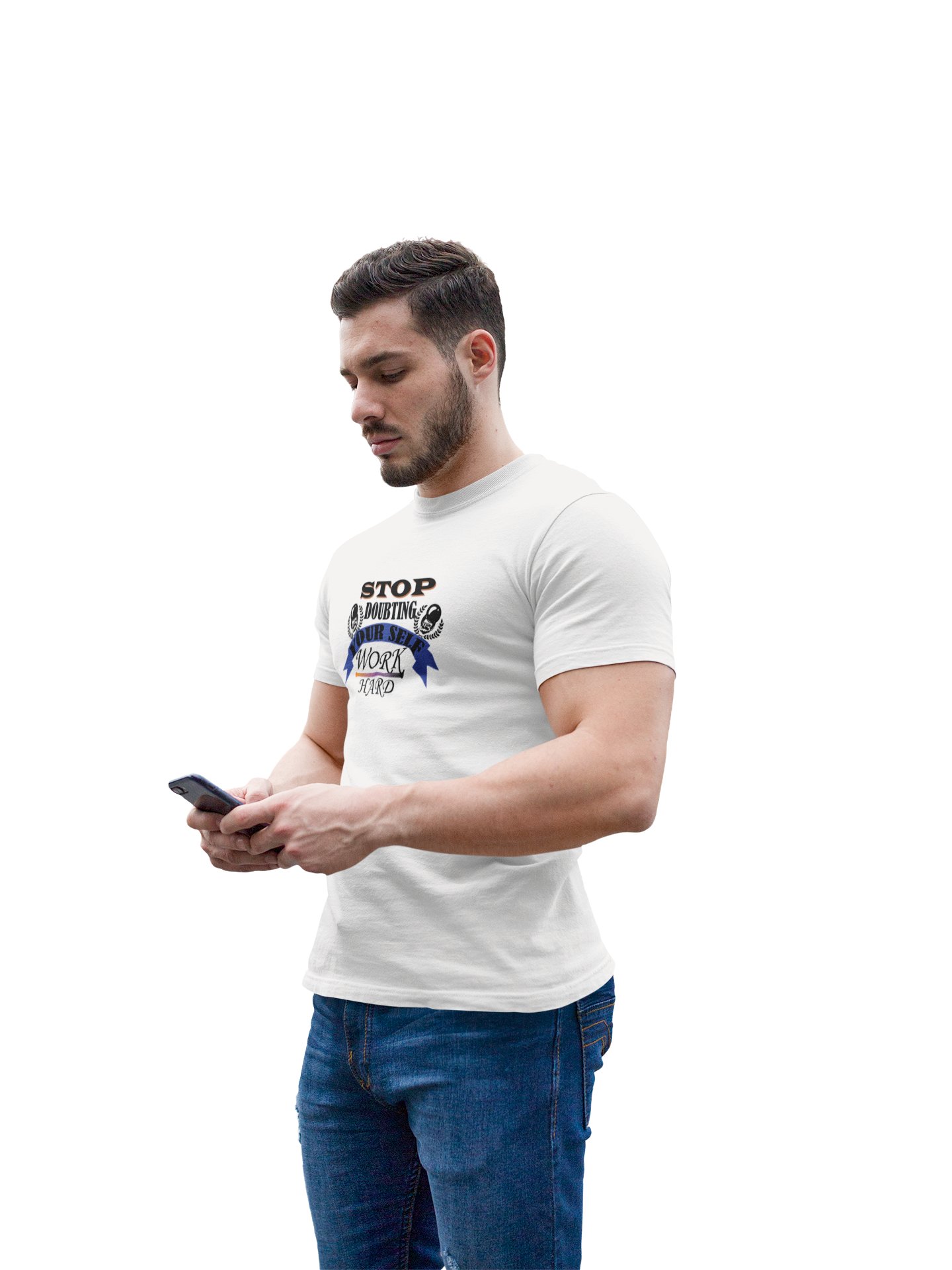 Stop Doubting Yourself, Work Hard, Round Neck Gym Tshirt (White Tshirt) - Clothes for Gym Lovers - Suitable for Gym Going Person - Foremost Gifting Material for Your Friends and Close Ones