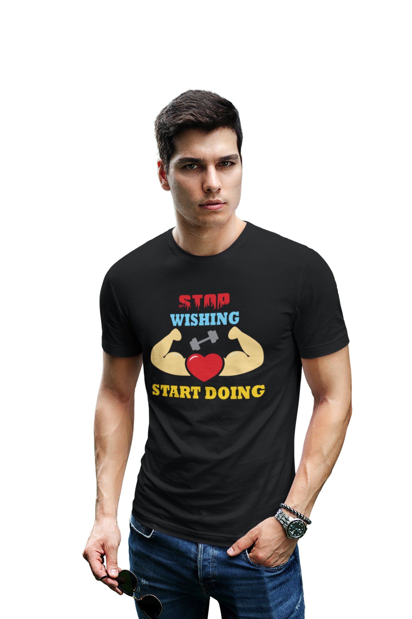 Stop Wishing, Start Doing, (BG Red, Blue and Yellow), Round Neck Gym Tshirt (White Tshirt) - Clothes for Gym Lovers - Suitable for Gym Going Person - Foremost Gifting Material for Your Friends and Close Ones