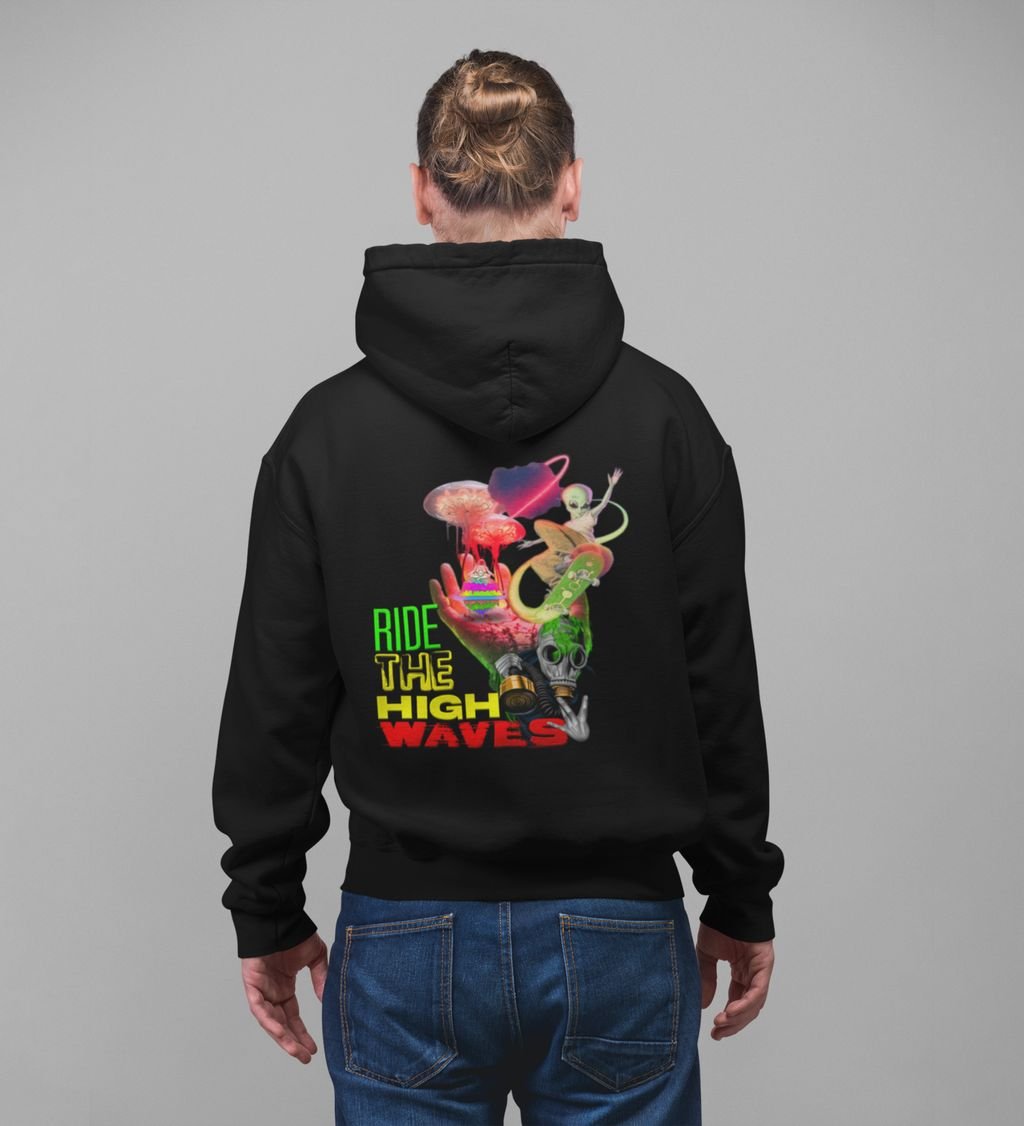 Surf the Cosmic Flow Ride The High Waves Black Cotton Printed Hoodies For Men