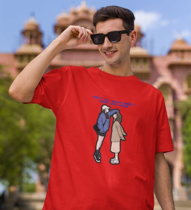 Tall And Short Duo Red Round Neck Cotton Half Sleeved Men T Shirt with Printed Graphics