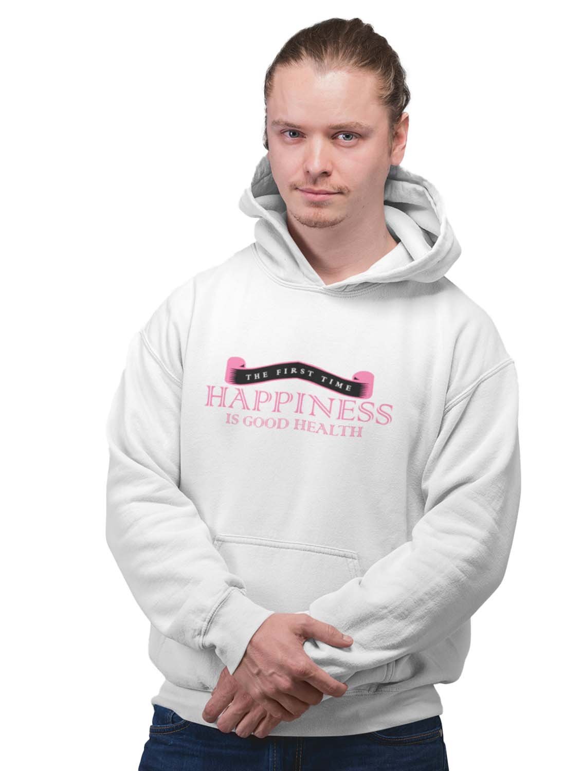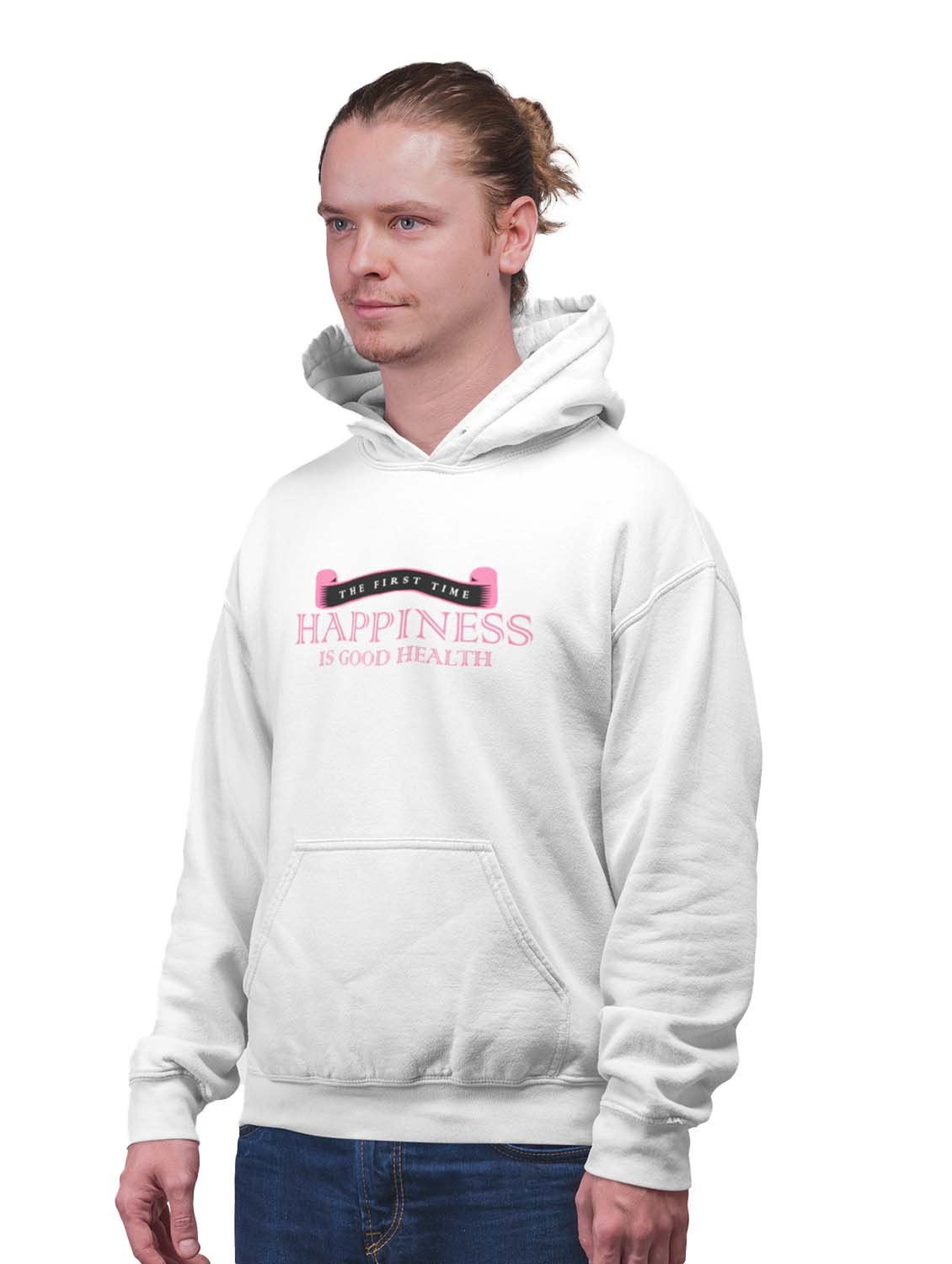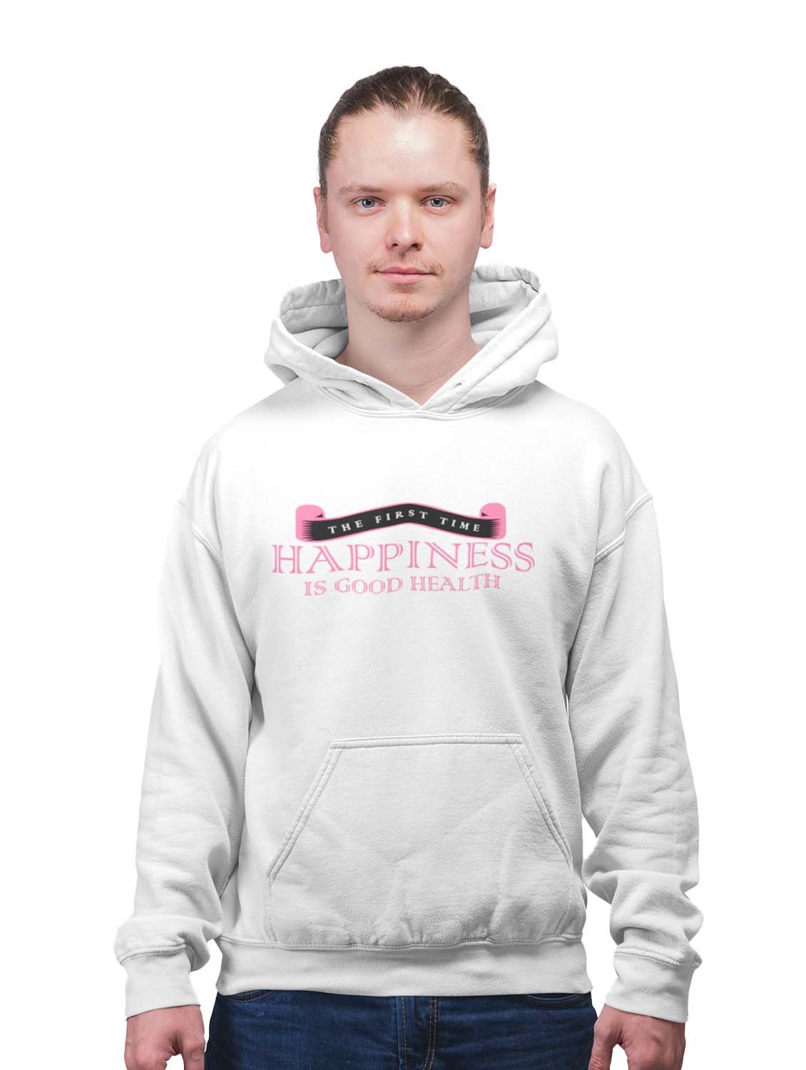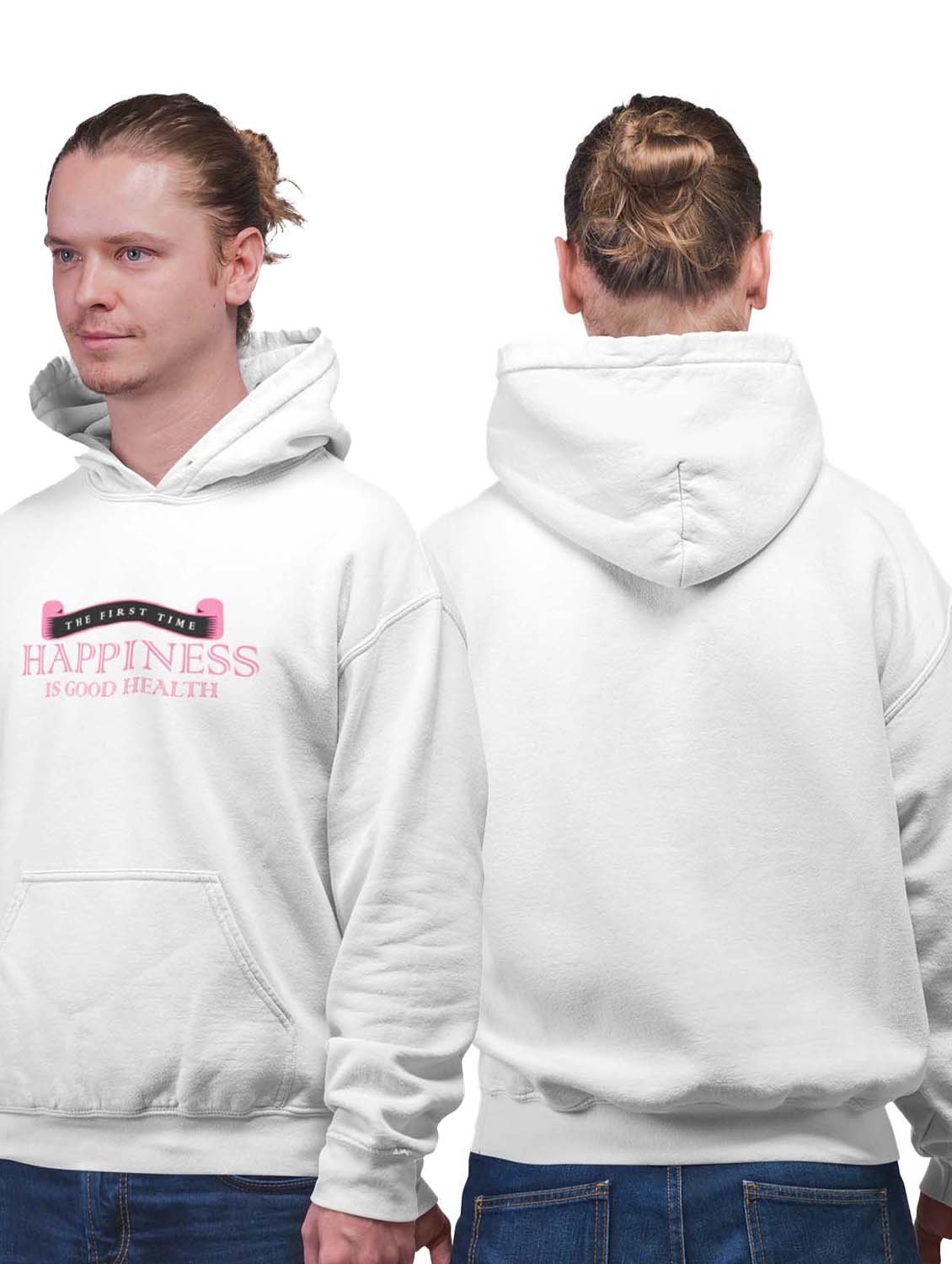 The First Time, Happiness Is Good Health printed artswear white hoodies for winter casual wear specially for Men