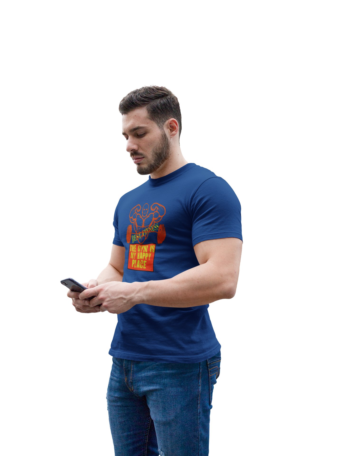 The Gym Is My Happy Place, (BG Orange), Round Neck Gym Tshirt (Blue Tshirt) - Clothes for Gym Lovers - Suitable for Gym Going Person - Foremost Gifting Material for Your Friends and Close Ones