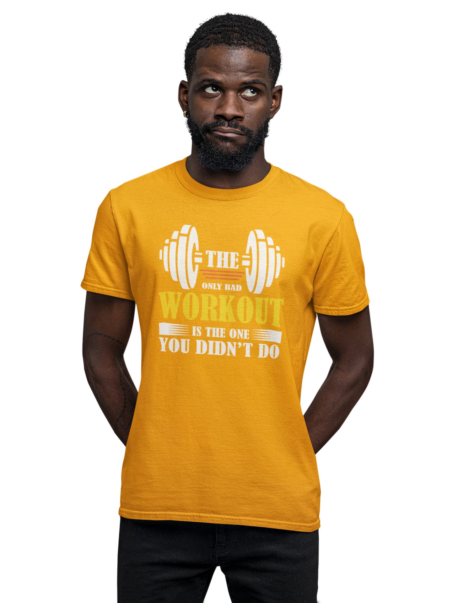 The Only Bad Workout is The One Round Neck Gym Tshirt (White, Yellow, Orange Outline) (Yellow Tshirt) - Clothes for Gym Lovers - Suitable for Gym Going Person - Foremost Gifting Material for Your Friends and Close Ones