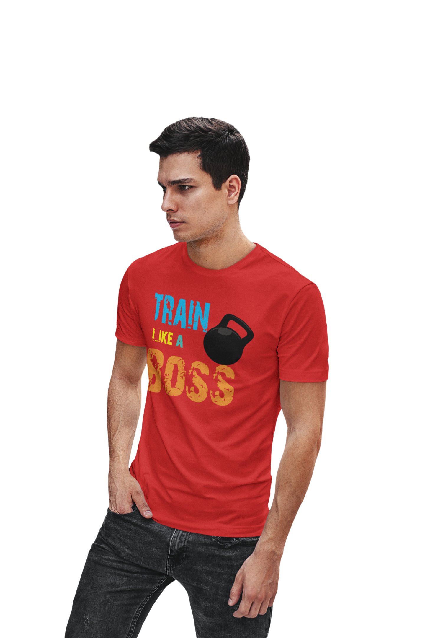 Train Like A Boss, (BG Blue, Yellow, Green and Orange), Round Neck Gym Tshirt (Red Tshirt) - Clothes for Gym Lovers - Foremost Gifting Material for Your Friends and Close Ones