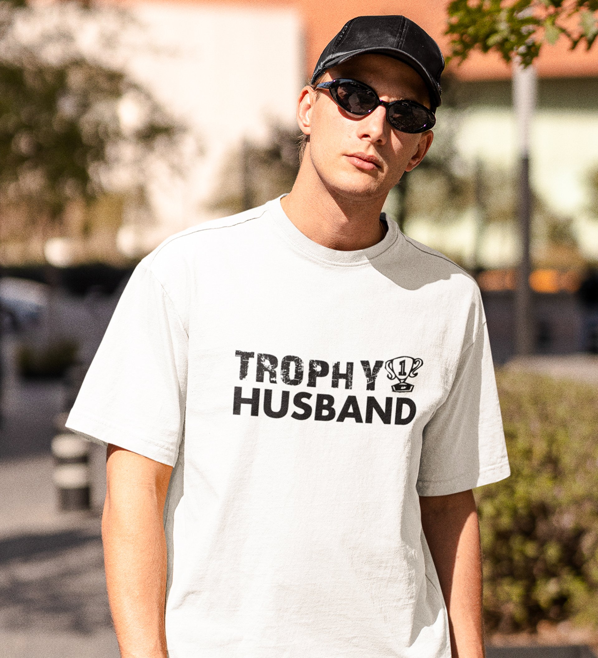 Trophy Husband White Round Neck Cotton Half Sleeved Men's T-Shirt with Printed Graphics