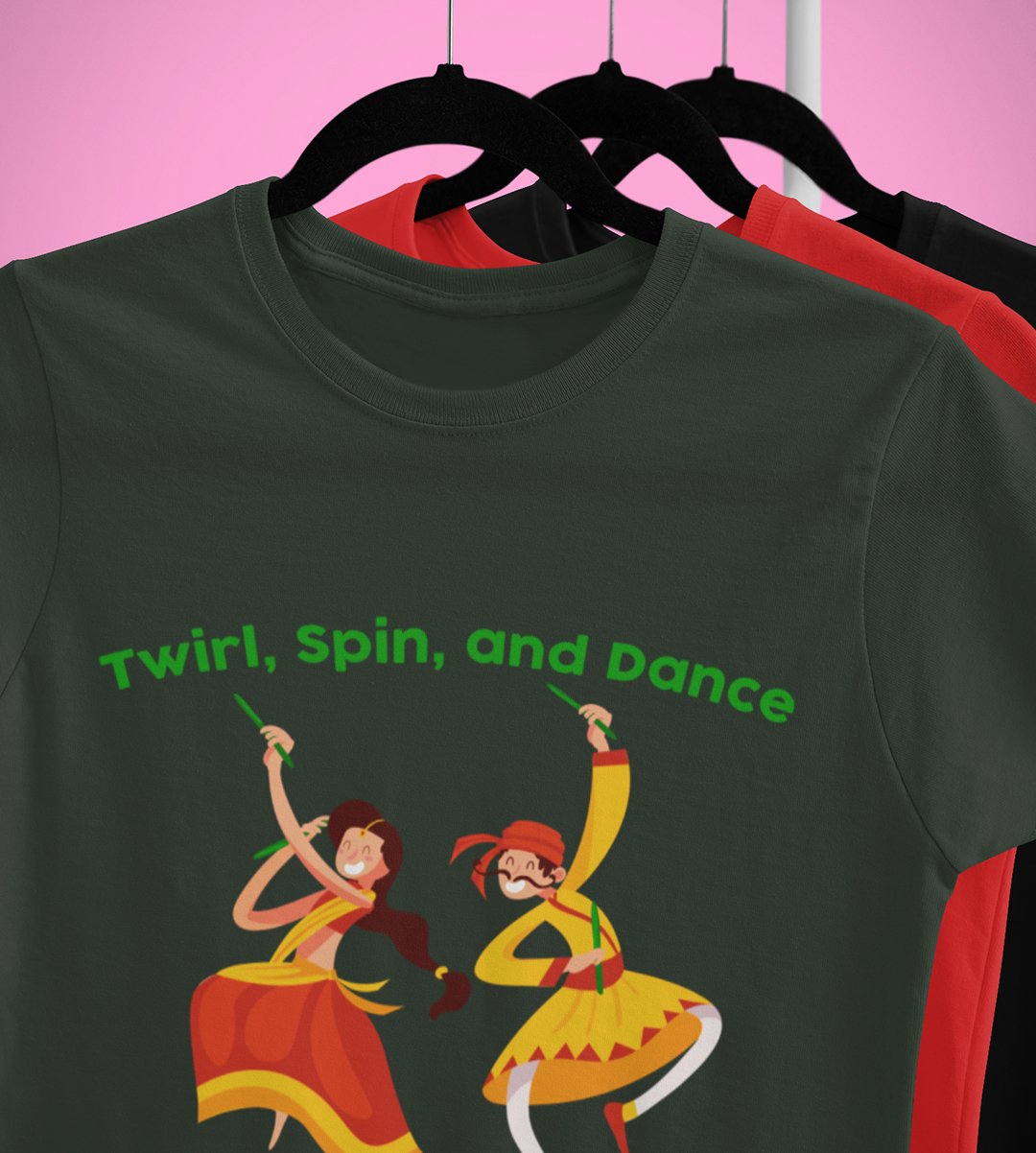 Twirl, spin and dance printed unisex adults round neck cotton half-sleeve green tshirt specially for Navratri festival/ Durga puja