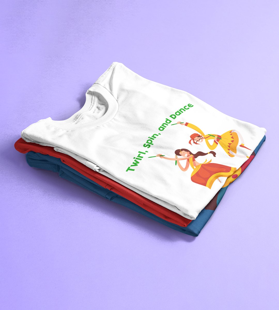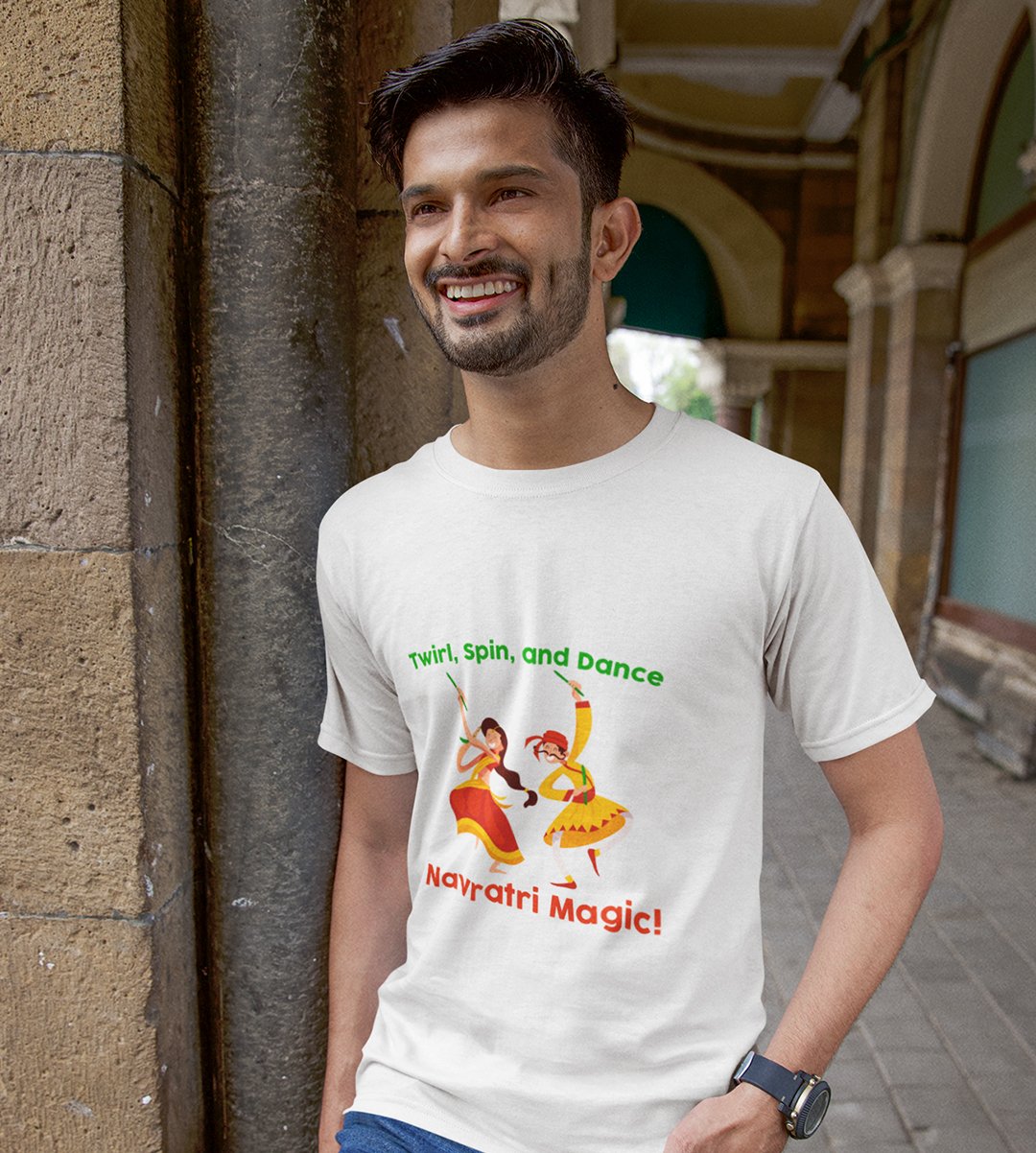 Twirl, spin and dance printed unisex adults round neck cotton half-sleeve white tshirt specially for Navratri festival/ Durga puja