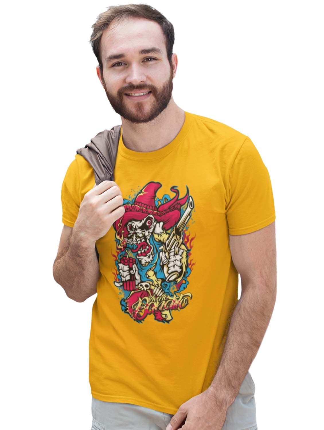 Skull Cowboy Yellow Round Neck Cotton Half Sleeved T-Shirt with Printed Graphics