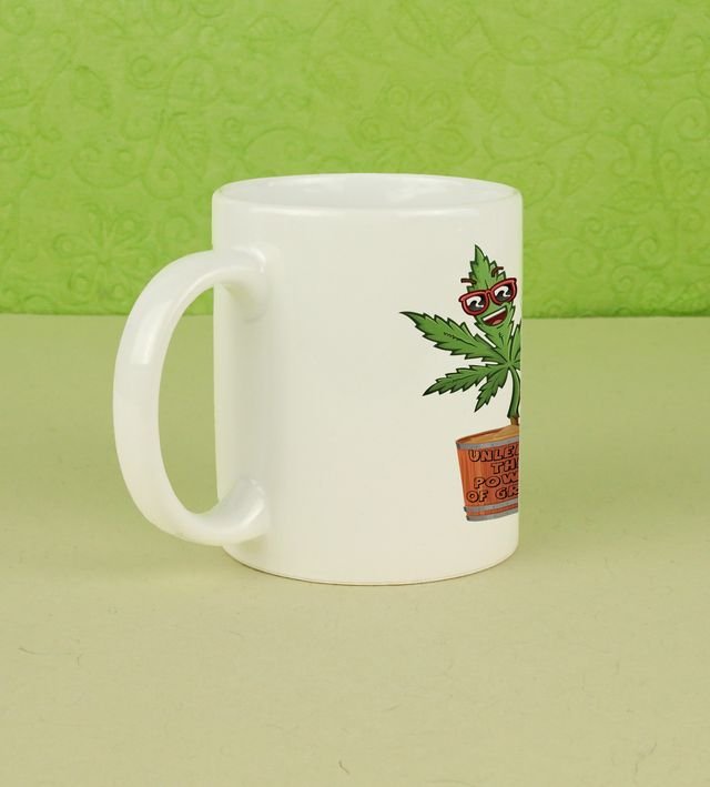 Start your day with a burst of vibrant energy! This printed coffee mug features a psychedelic leaf artwork surrounded by colorful flame-like patterns