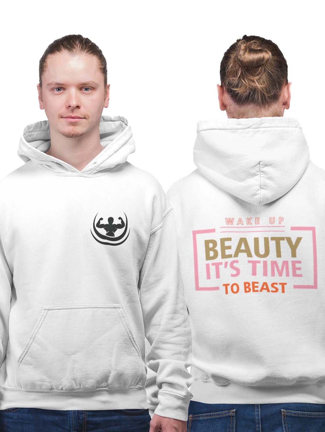 Wake Up, Beauty printed activewear white hoodies for winter casual wear specially for Men