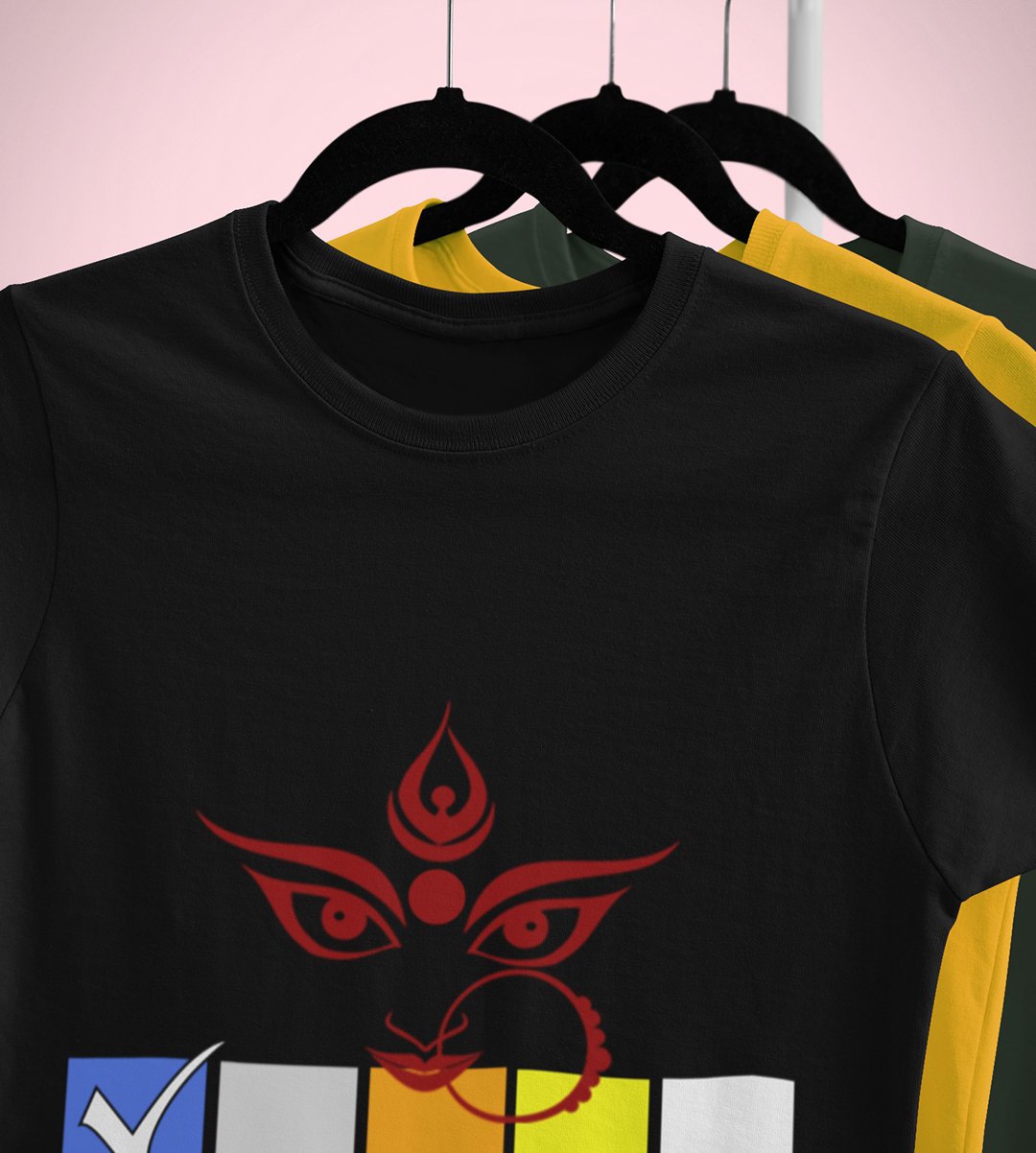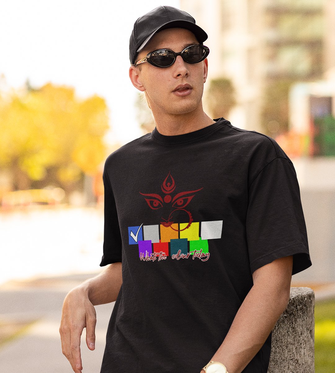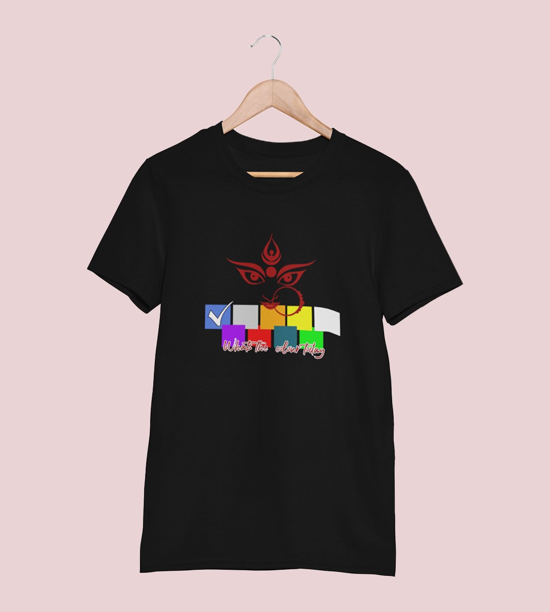 Whats the colour printed unisex adults round neck cotton half-sleeve black tshirt specially for Navratri festival/ Durga puja