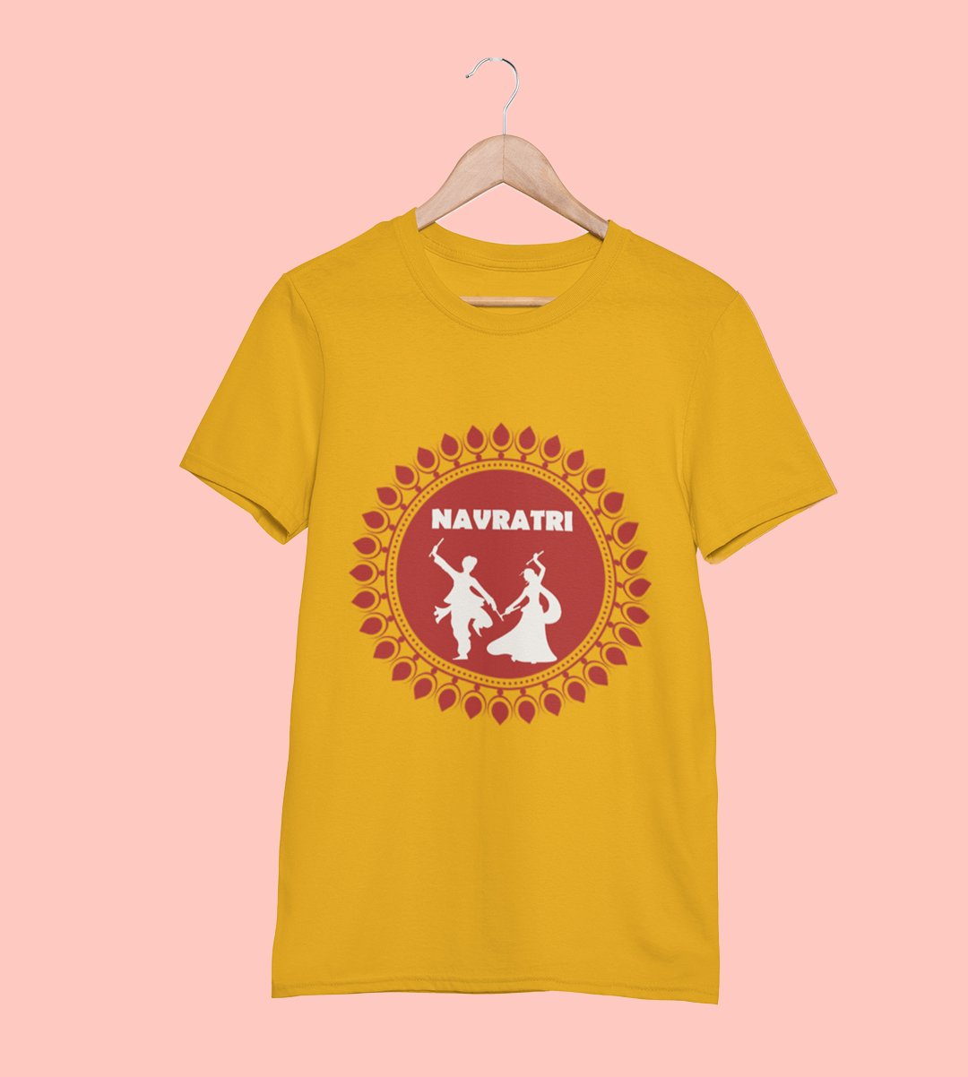 Navratri is a very auspicious festival for hindus. It takes place at the beginning of October and sometimes September. Enjoy the 9 days of festivities with full zeal and make yourself submerged in the love of Maa Durga. Navratri is also known as Durga Puja. And with this Tees, you can shine like a star during this festive season with our navratri themed cotton half sleeved Tshirts. You can pair our t-shirts with trousers and denim of your choice and make it a weekday smart casual or weekend wear. This is durable. This tshirt is smooth and soft which makes you comfortable to wear during all seasons. The printing in it is durable and odourless. It has five sizes, S,M,L,XL,XXL. The Tshirt colour is intact even after repeated washes. It can be kept in your wardrobe and hangers. Please avoid washing mashine to clean this Tee, it may affect the print. Hand wash only. We have brought you many navratri related designs printed on our different colour Tshirts to choose from. Grab it now.