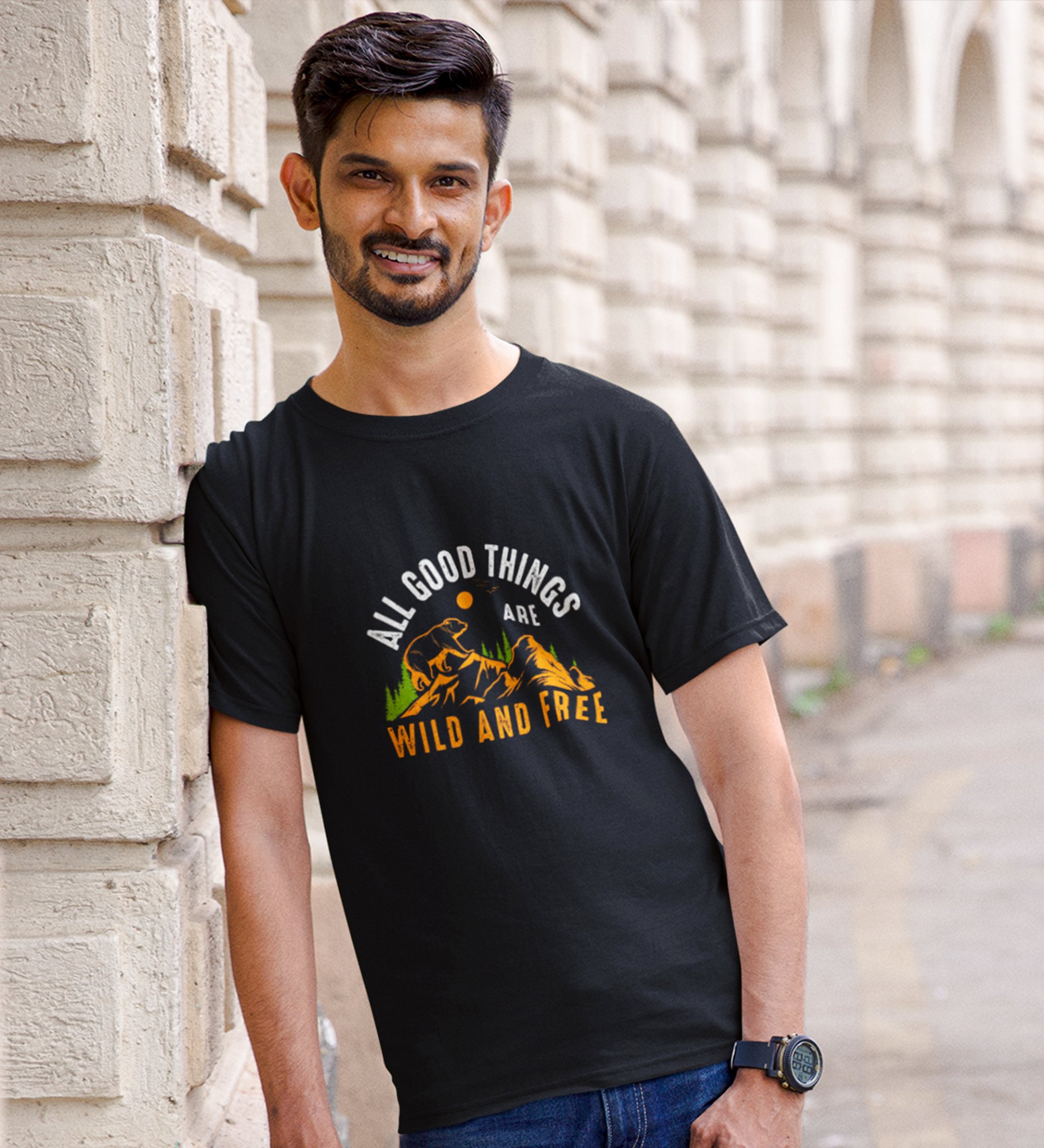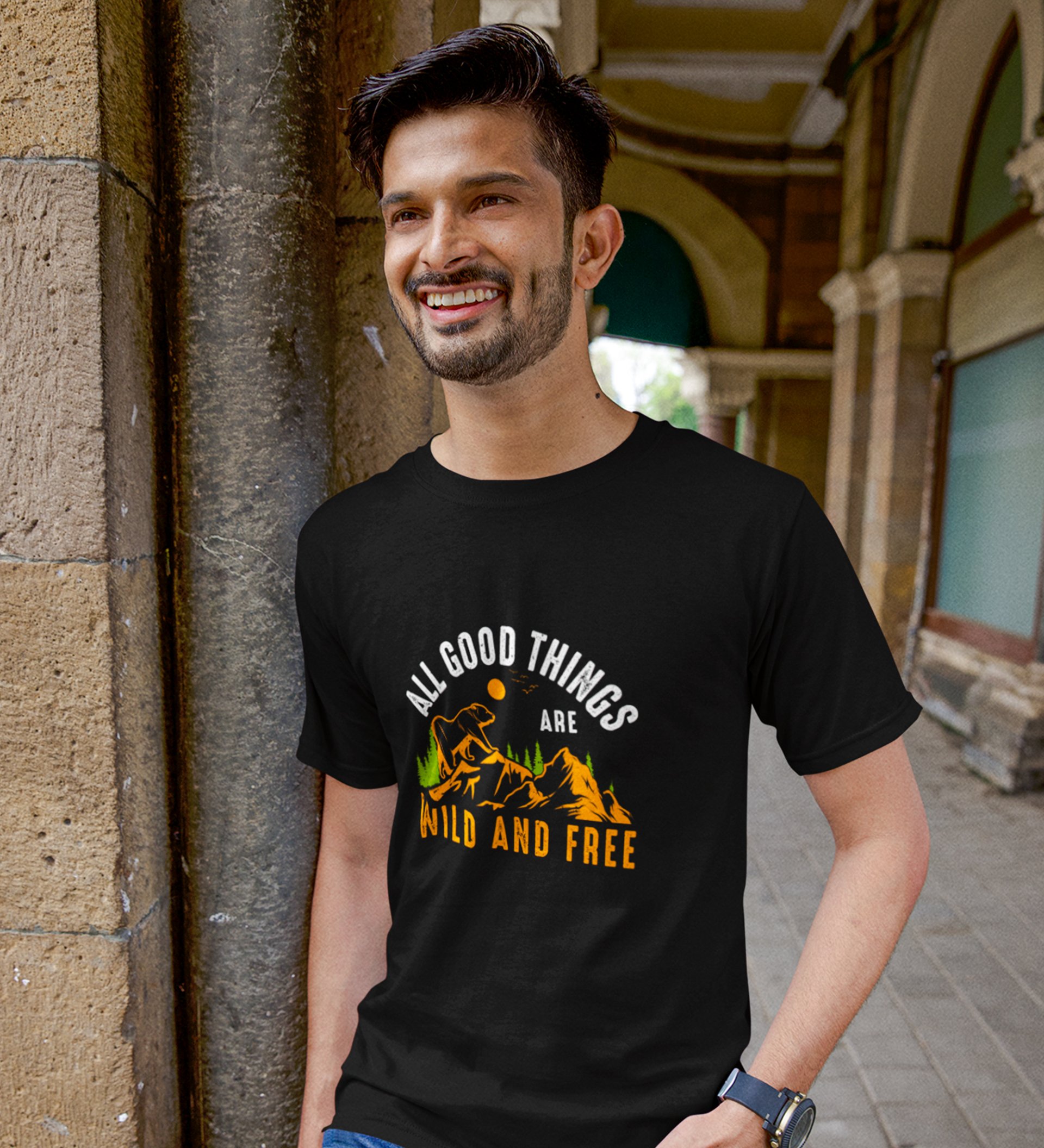 JD.TRENDS Wild & Free Black Round Neck Cotton Half Sleeved Men's T-Shirt with Printed Graphics