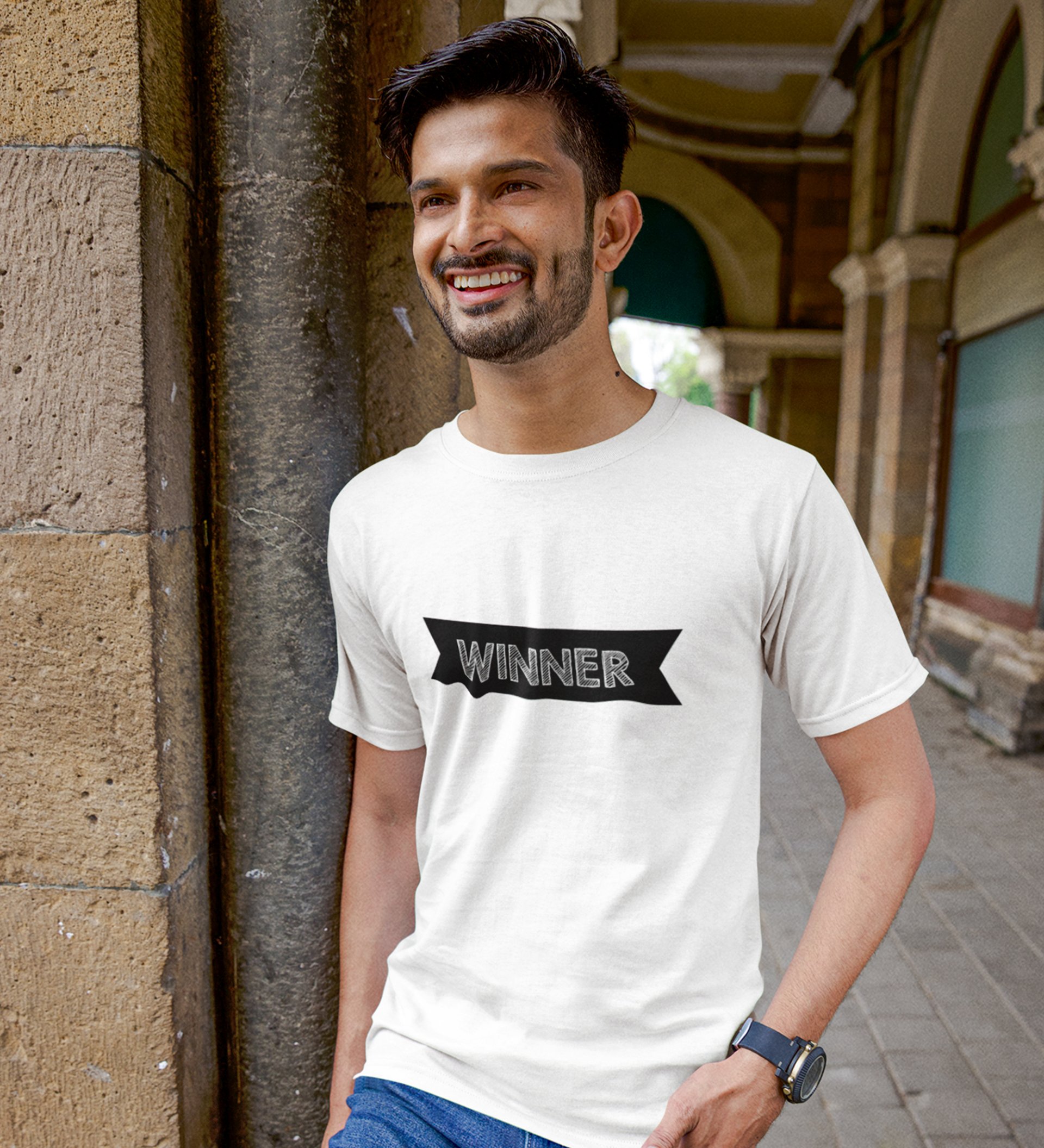 Winner White Round Neck Cotton Half Sleeved Men's T-Shirt with Printed Graphics
