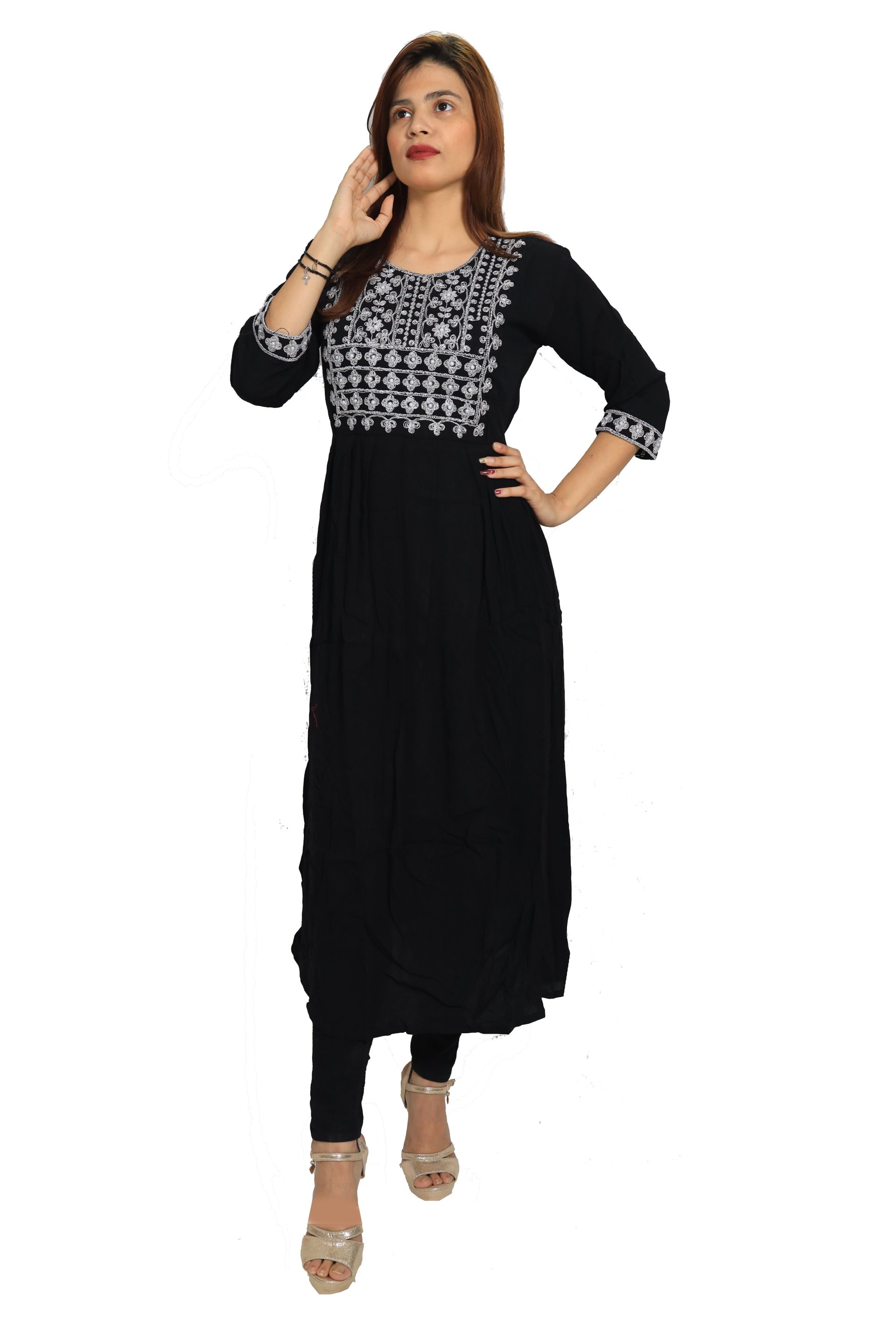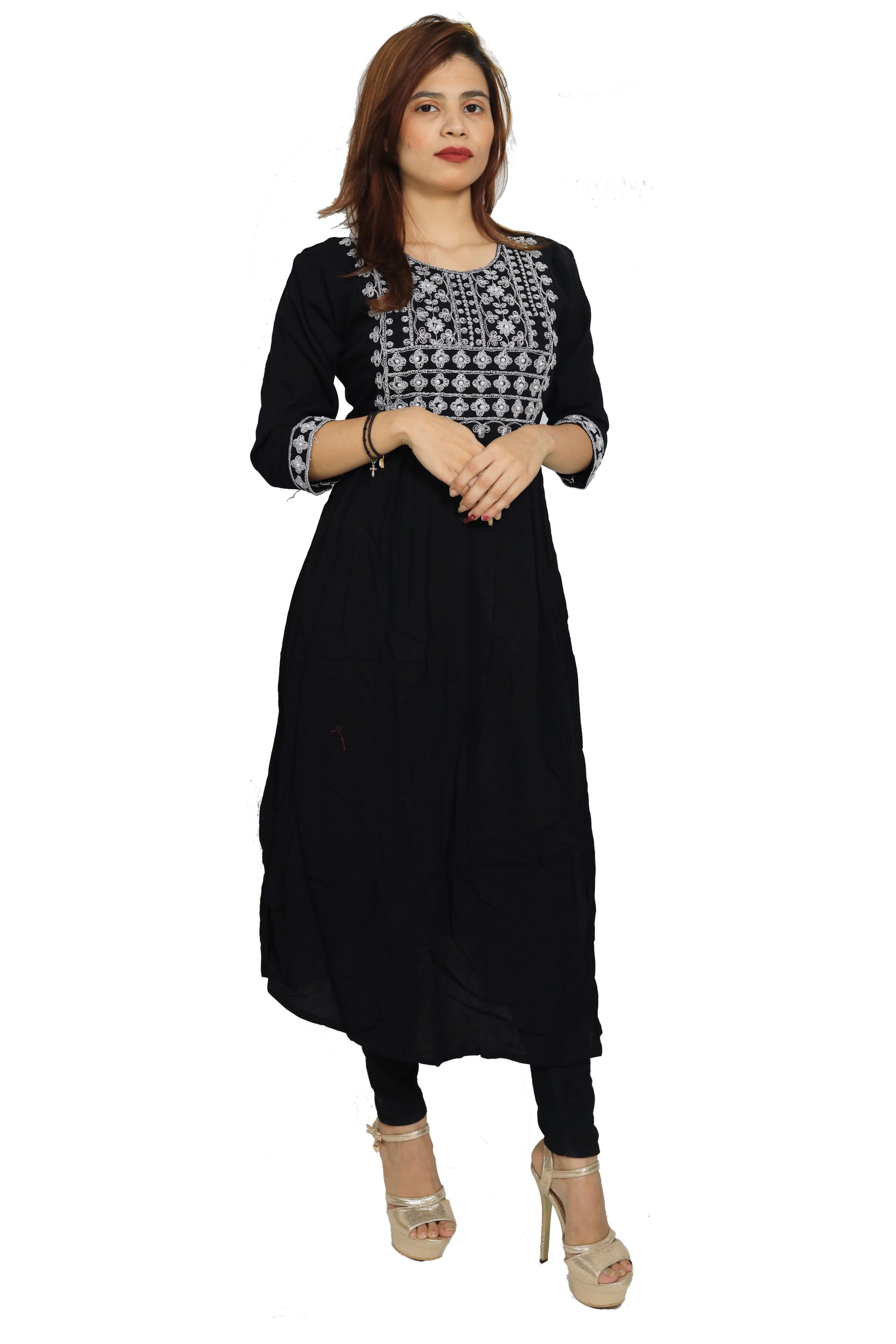 Four petals flower pearl embroided straight Kurti for Womens/ girls (black kurti)- Made up of Rayon and designed for you plesant and comfy